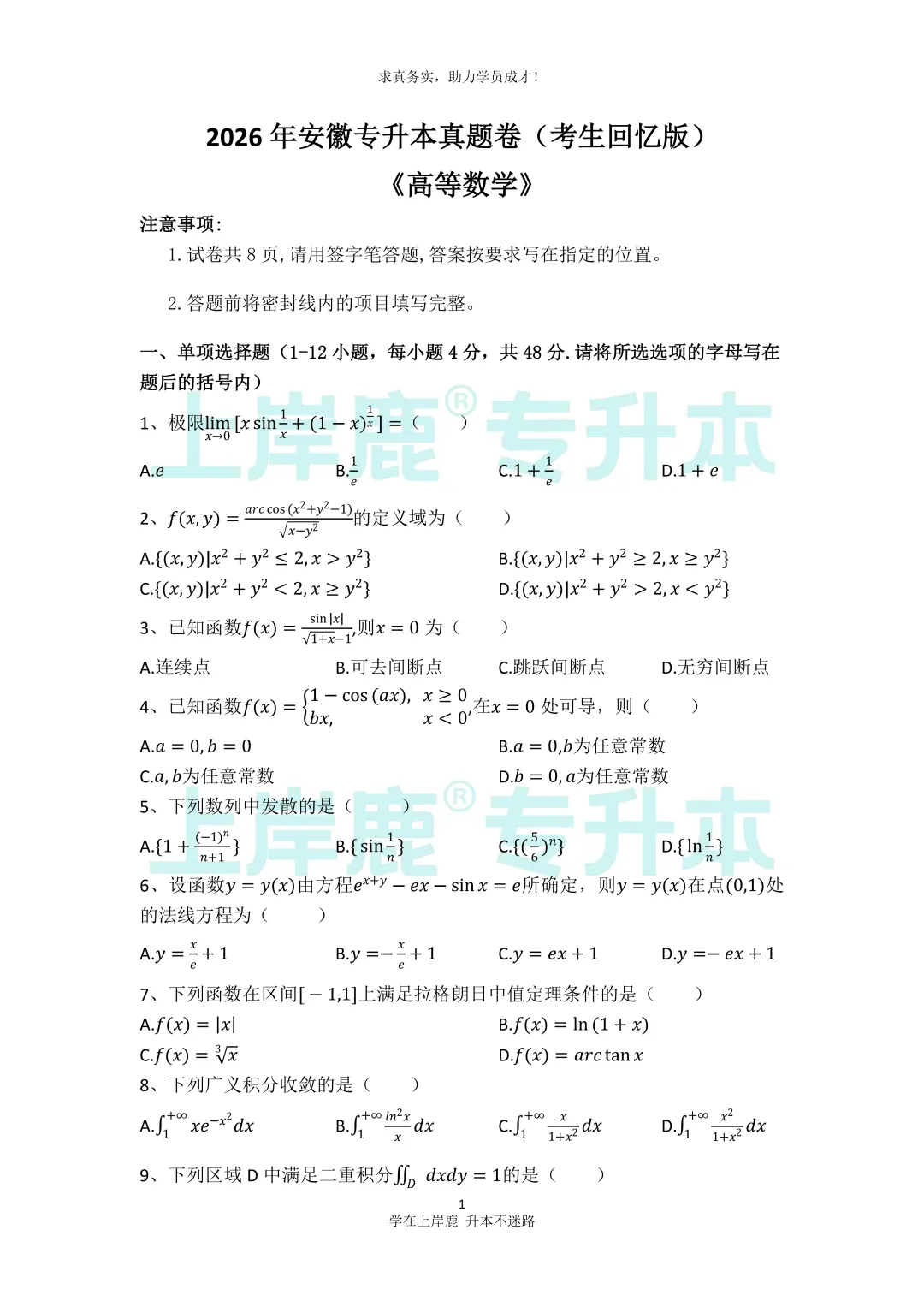 2026年安徽省普通高校专升本公共课考试已经结束,下面和小鹿一起来看看2026专升本考试公共课数学的真题吧!