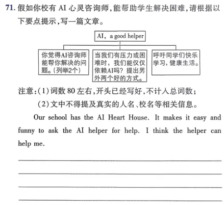 Our school has the AI Heart House. It makes it easy and funny to ask the AI helper for help. I think the helper can help me work out study problems and deal with the stress from exams. When we feel stressed or upset, we can't only depend on AI. We can also talk to our teachers or parents, or do some sports to relax ourselves. Let's make good use of this AI helper. Wish all of us study happily and live healthily.