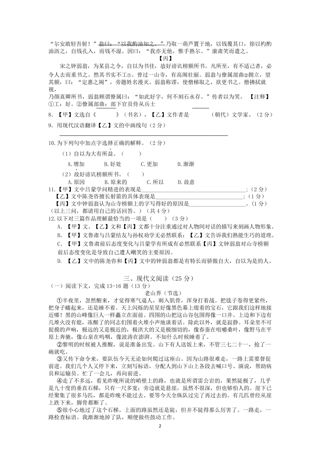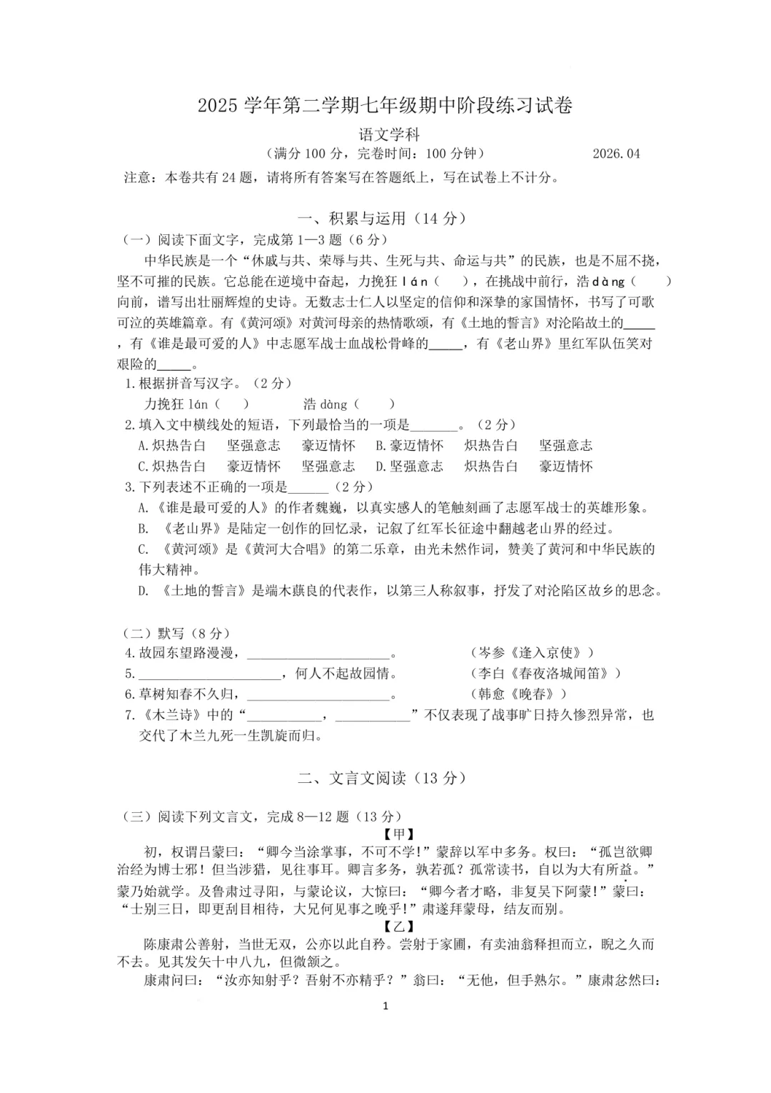【七年级粮道街语文期中试卷】2025-2026下学期