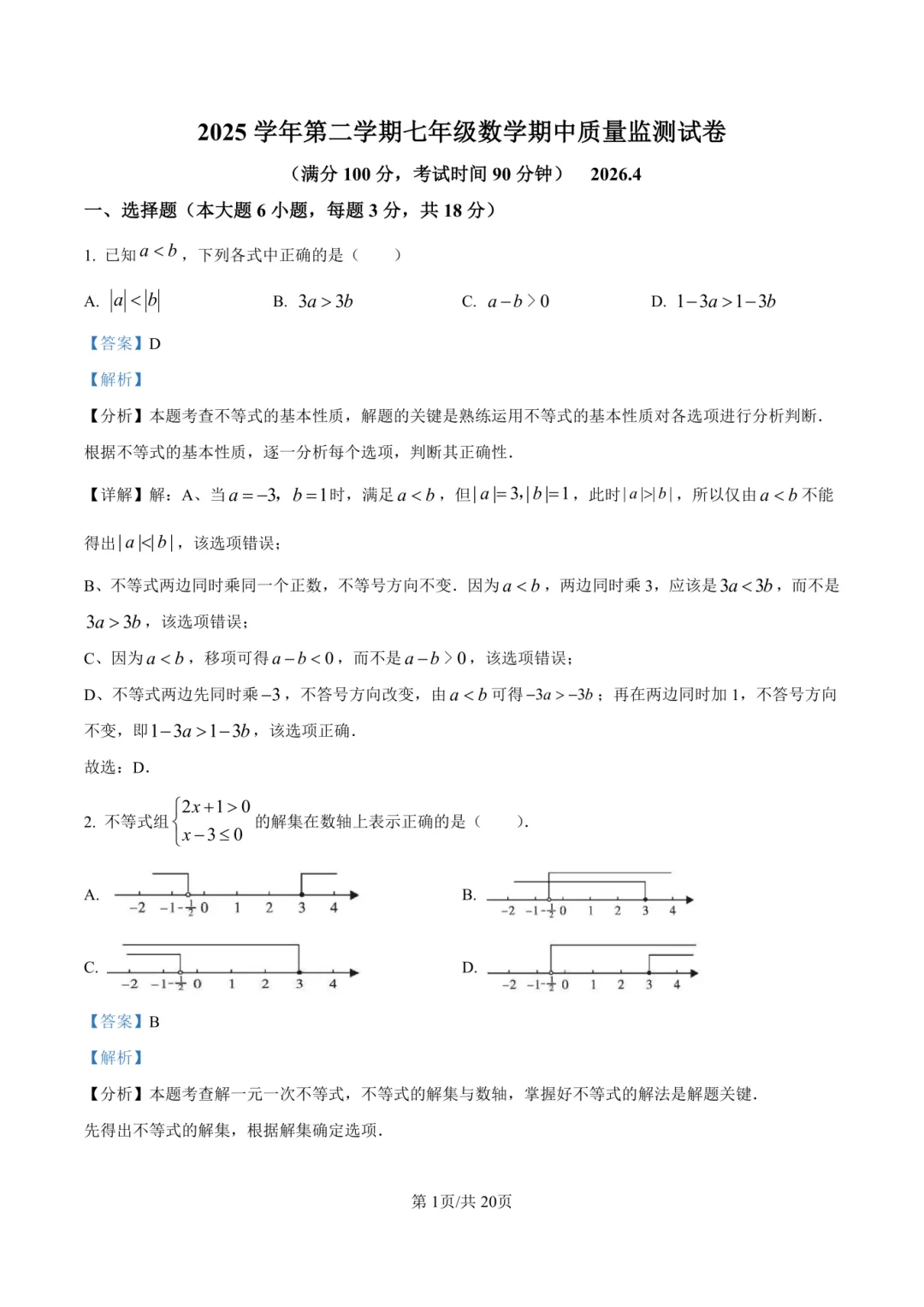 2026新(苏科版)七年级下册数学期中试卷+解析(拔尖+培优卷)多套,电子版可打印!