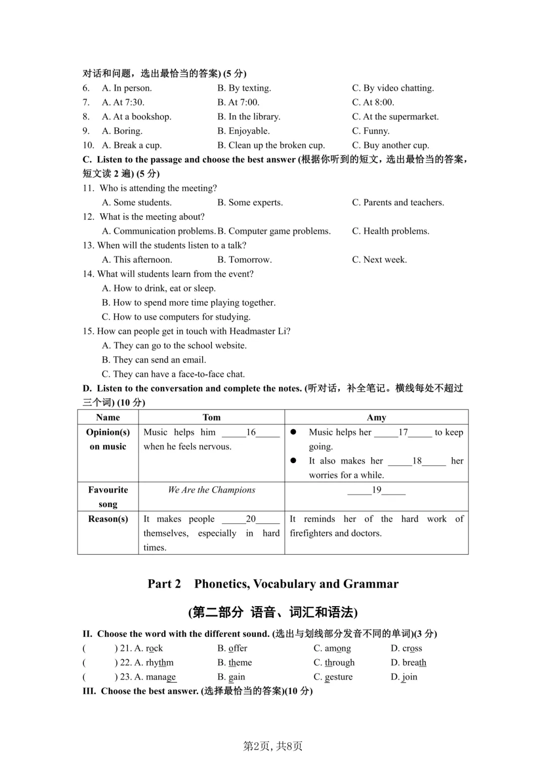 【9三模】C20教育联盟三模试卷及答案含听力(语文、数学、英语、物理、化学、历史、道法)附英语解析