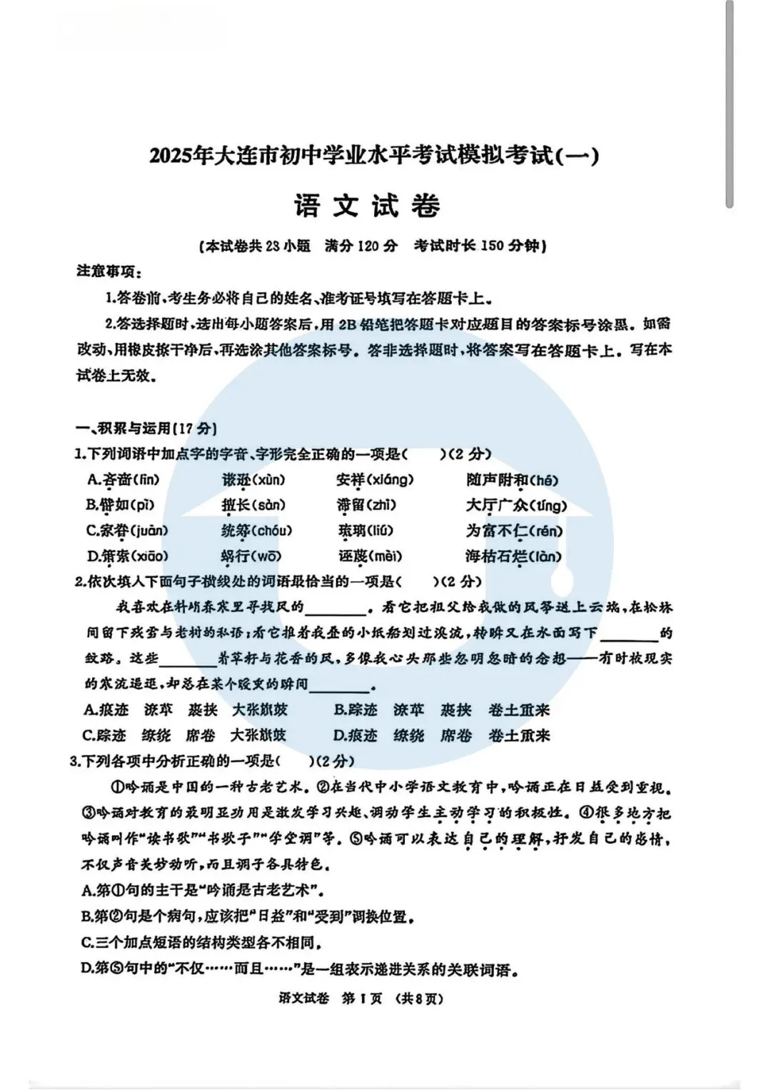2026辽宁大连九年级中考一模考试时间,附25年一模真题卷