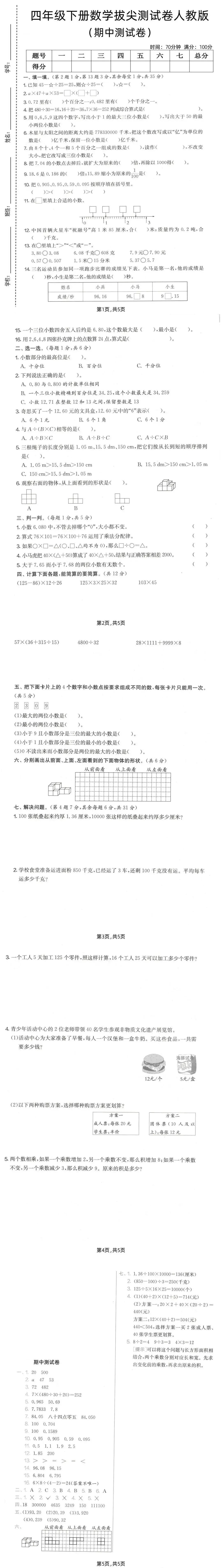 26春四年级下册人教数学《期中考试情景试卷+拔尖试卷》3套,有答案