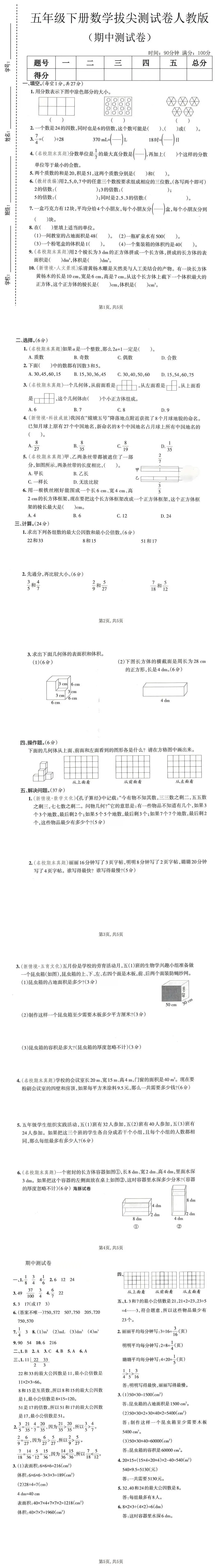 26春五年级下册人教数学《期中考试情景试卷+拔尖试卷》3套,有答案