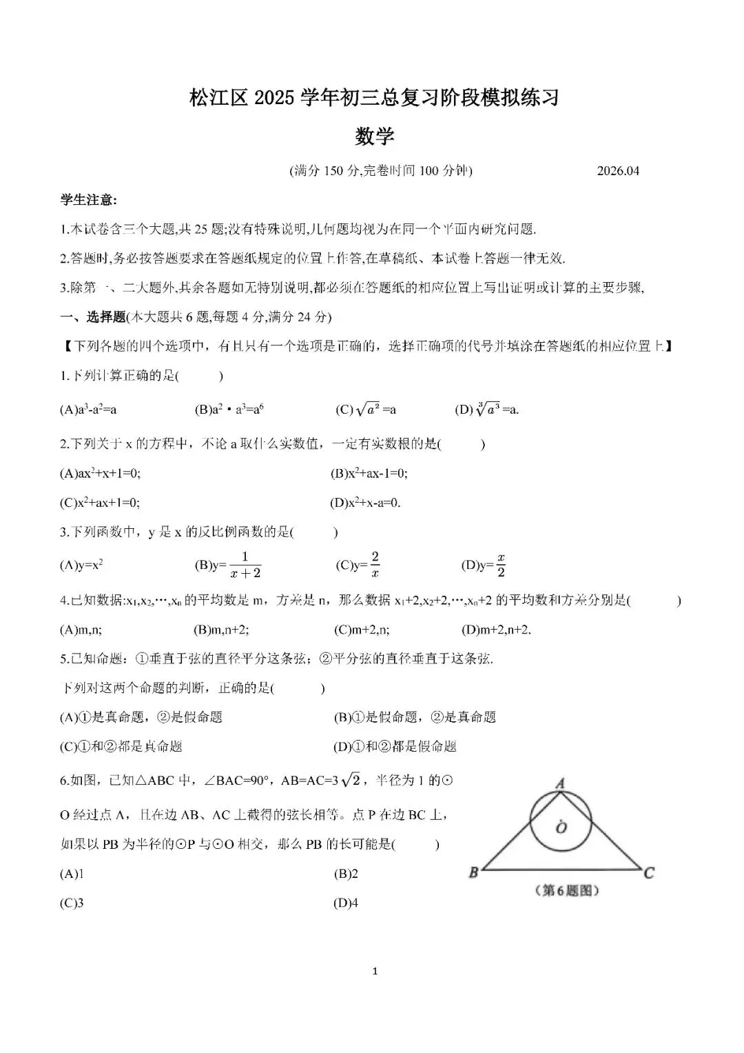 2026上海松江区初三二模各科试卷含答案解析(不断更新)