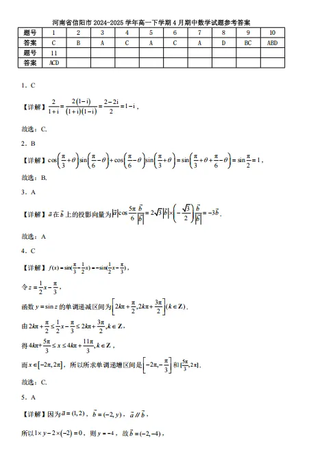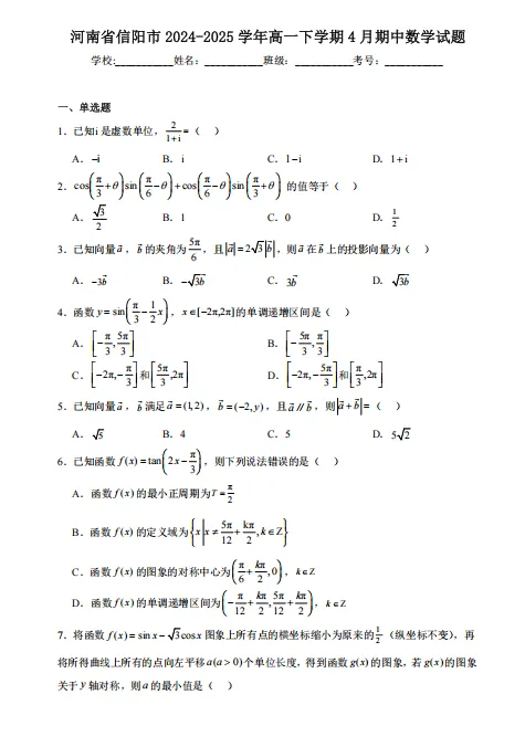【高一】期中丨往期试卷-河南省信阳市2024-2025学年高一下学期4月期中考试