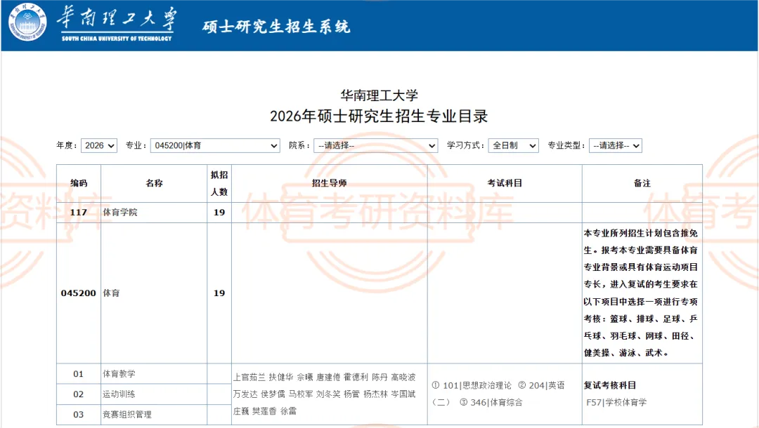 我校2026年硕士研究生招生专业、各专业招生计划数及考试科目见《2026年硕士研究生招生专业目录》。专业目录中公布的招生计划数包含推荐免试生人数及相关专项计划。除125100工商管理、125200公共管理、125601工程管理以及单独考试招生专业(方向)外,我校其他招生专业(方向)均接收推荐免试生。各专业录取的推荐免试生将于10月中下旬在华南理工大学研究生招生网公布。各专业招生计划可根据教育部最终下达计划数与生源情况进行适当微调。