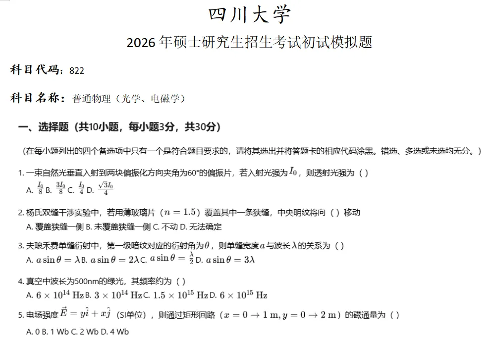 >四川大学822普通物理考研真题模拟