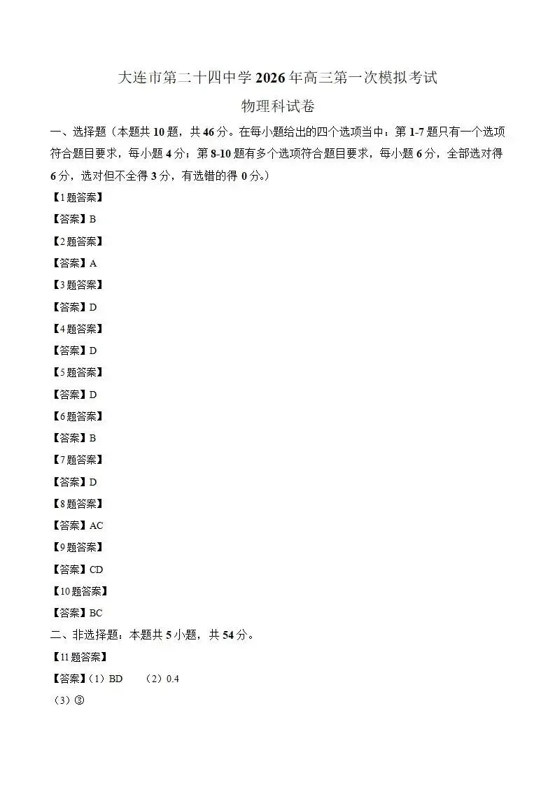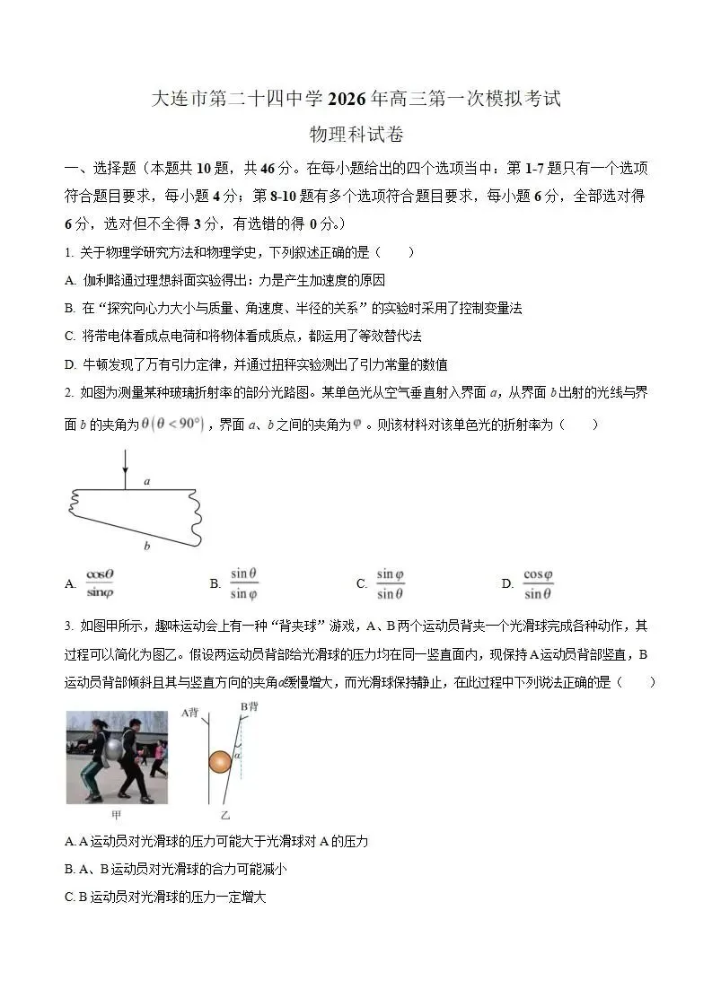 当前位置:首页>考研真题>《高中试卷》大连市第二十四中学2026届高三下学期第一次模拟考试物理(含答案)