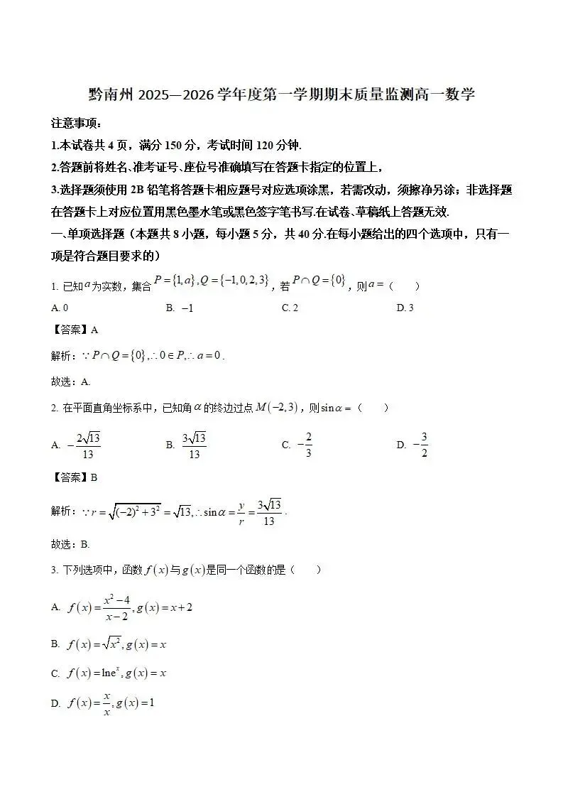 当前位置:首页>考研真题>《高中试卷》贵州省黔南州2025-2026学年高一上学期期末质量监测数学(含答案)
