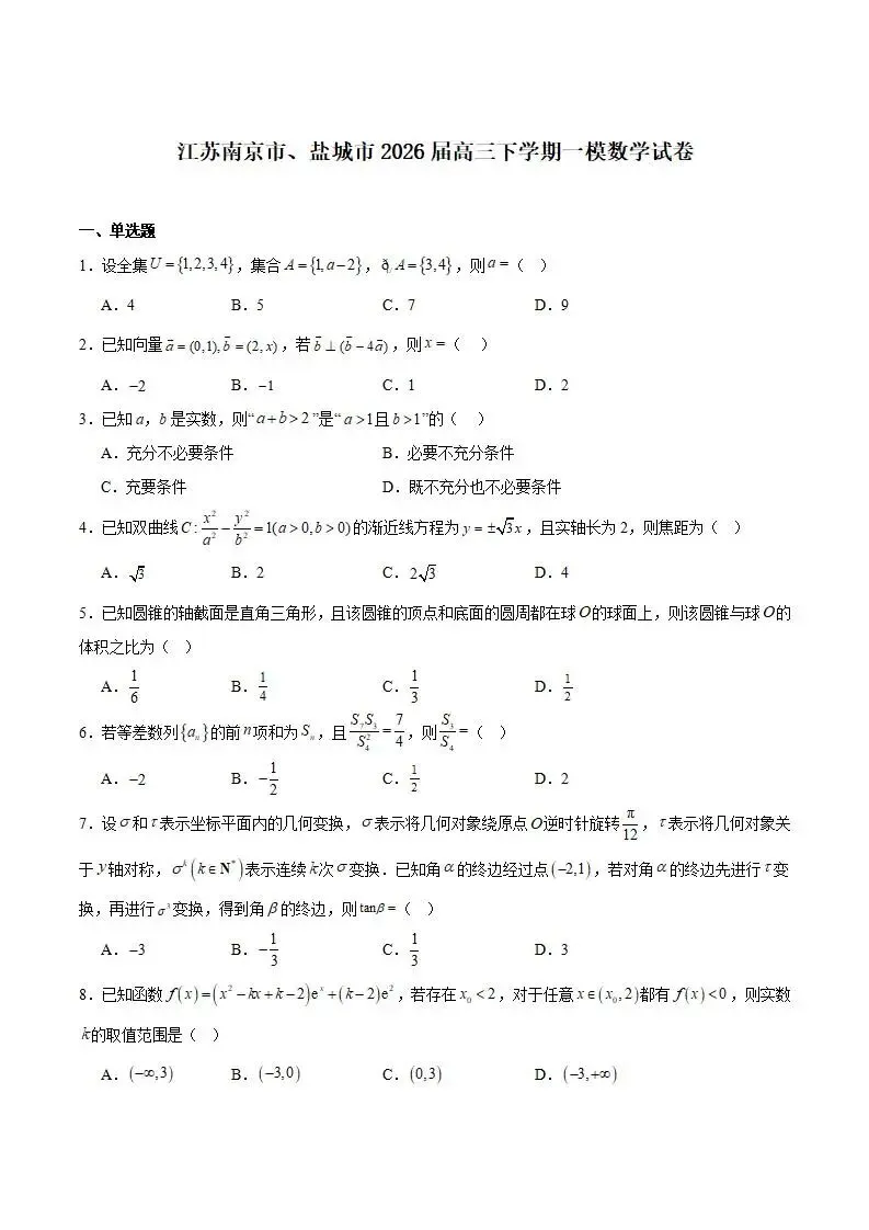 当前位置:首页>考研真题>《高中试卷》江苏南京市、盐城市2026届高三下学期第一次模拟数学(含答案)