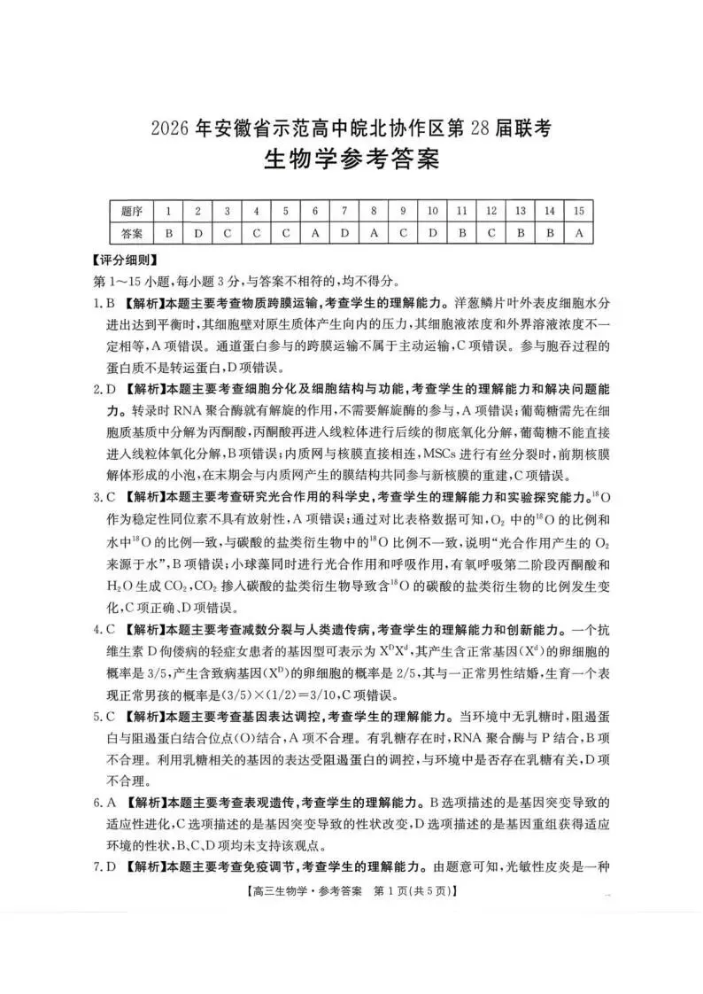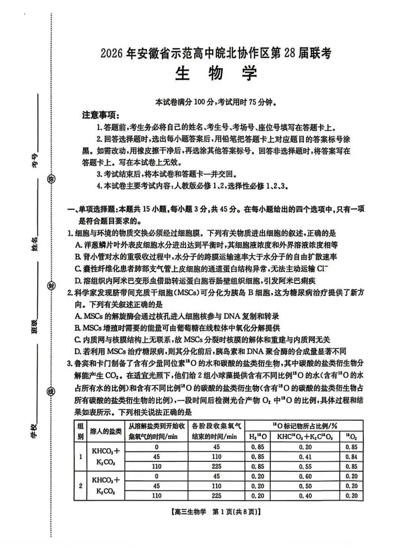 当前位置:首页>考研真题>《高中试卷》安徽省示范高中皖北协作区2026届高三下学期第28届联考(一模)生物(含答案)