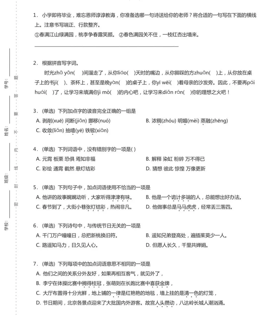 一到六年级下册语文期中考试试卷(含答案)pdf电子版,可打印