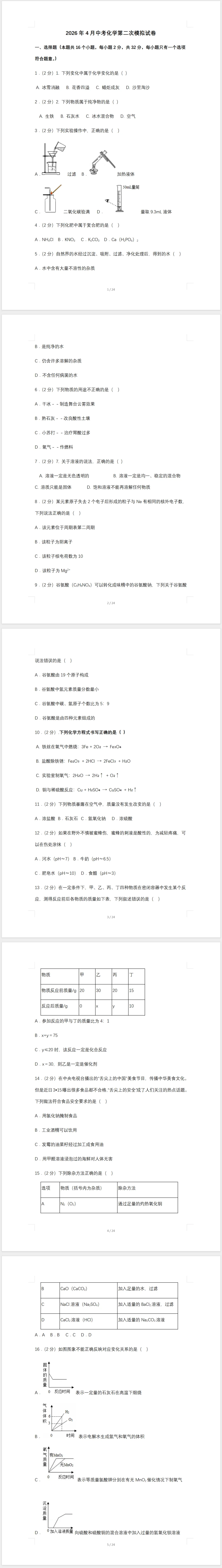 >2026年4月中考化学第二次模拟试卷及答案