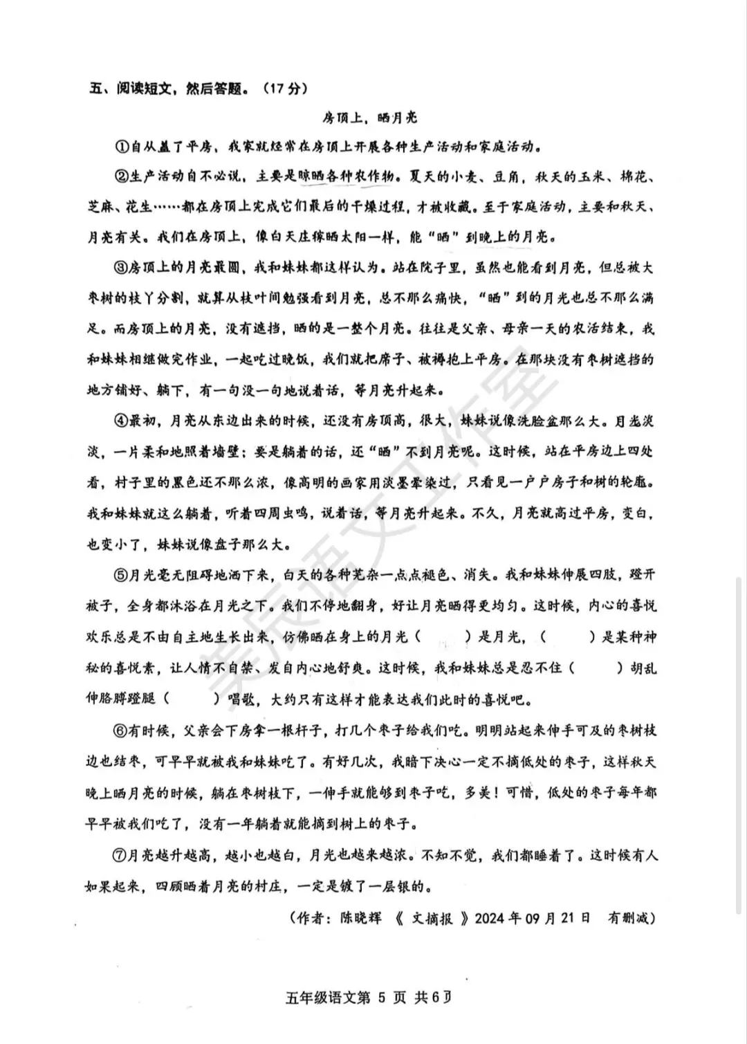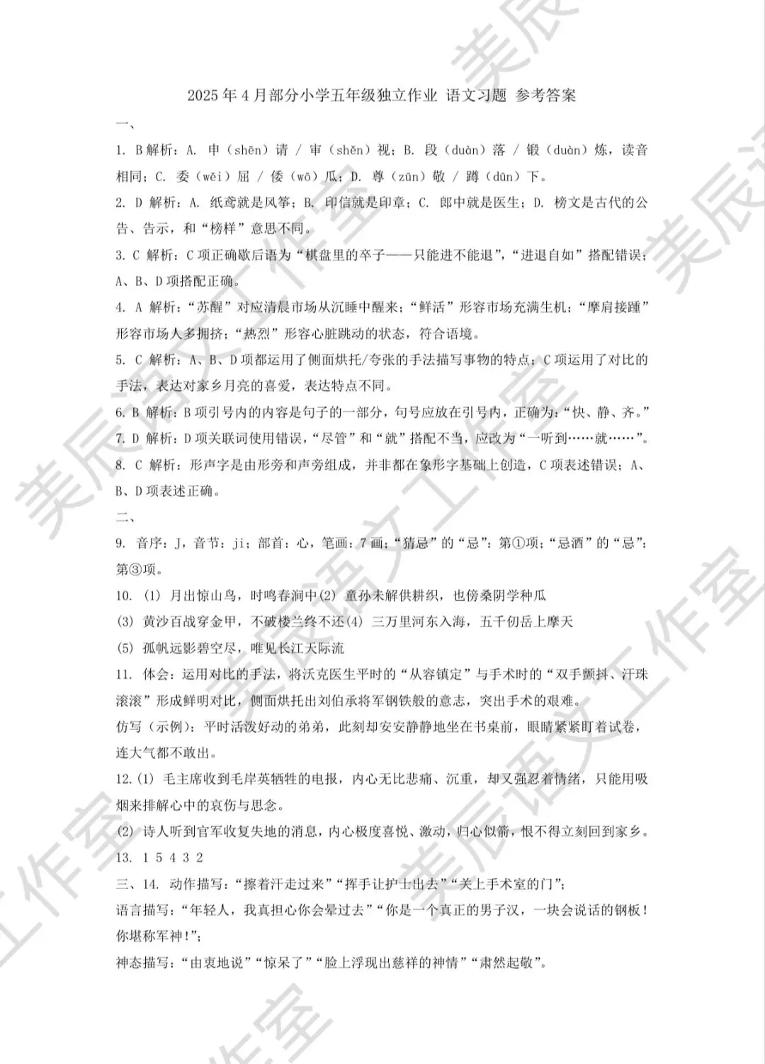 >2025年武汉市黄陂区五(下)语文期中试卷(含答案)