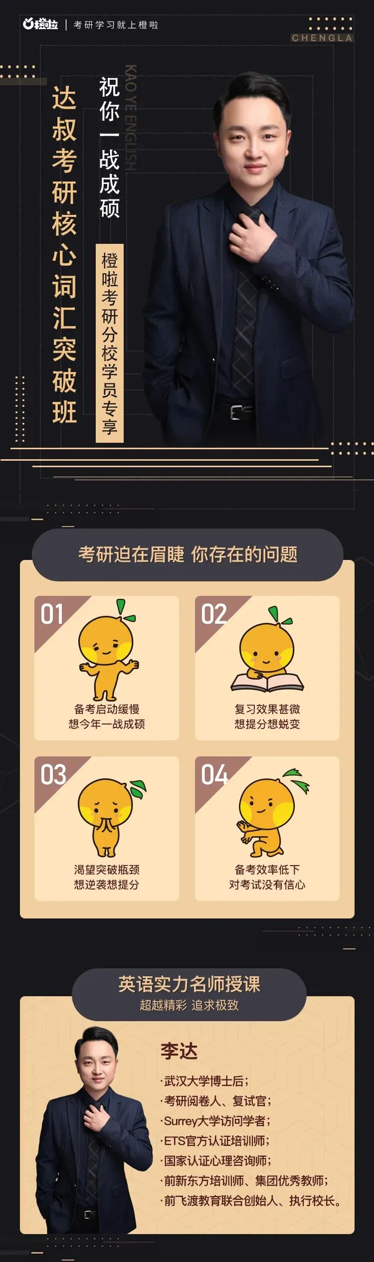 🍊小博提醒: 考研大纲规定的英语词汇量是5542个单词,这其实吓倒了大部分的在职考生。而事实上,这5542个单词,我们真的有必要一一过关吗?!其实啊,这里面是有N多都是我们中小学学过的最简单、最基础的词汇,比如“yes"、"no"、"yellow"、"blue"等等这样的词汇,就占到了2000+个,除开这一部分,也就剩下3956个词汇了。 还有第二类词汇,比如”zigzag"虽然出现在考研词汇的大纲中,但在这么多年的研究生入学考试中,不管是英语一、还是英语二,都从未出现过~而且在未来的考研中,会出现的概率也几乎为0。除掉这一类词汇,考研大纲词汇也就剩下2275个。 还有一类词汇,基本上也是可以剔除的,那就是同词根的衍生词,比如“happy"、”unhappy“、”happyniess"、"unhappyniess"等等……这种词汇也就是记住根词,也就可以认出对应的衍生词了。再次除掉这一类词汇,考研大纲词汇也就剩下926个词了,这926个词基本上就已经涵盖了考研阅读里面涉及到的90%的词汇量。 正所谓主要精力就是要用来解决最主要的矛盾!特别是针对在职备考生,在时间非常有限的情况下备考,稳抓核心词汇才是最关键、最高效的! 只要掌握核心单词以及有效的记忆方法,5500个单词不用全部强行记忆,同样能够帮助我们在短时间内快速打牢基础。把节省下来的时间用来其他科目的备考上,不香吗? 橙啦考研英语核心词汇课程免费领取,名额有限,从速领取!