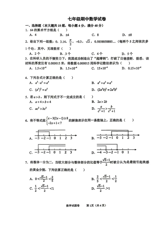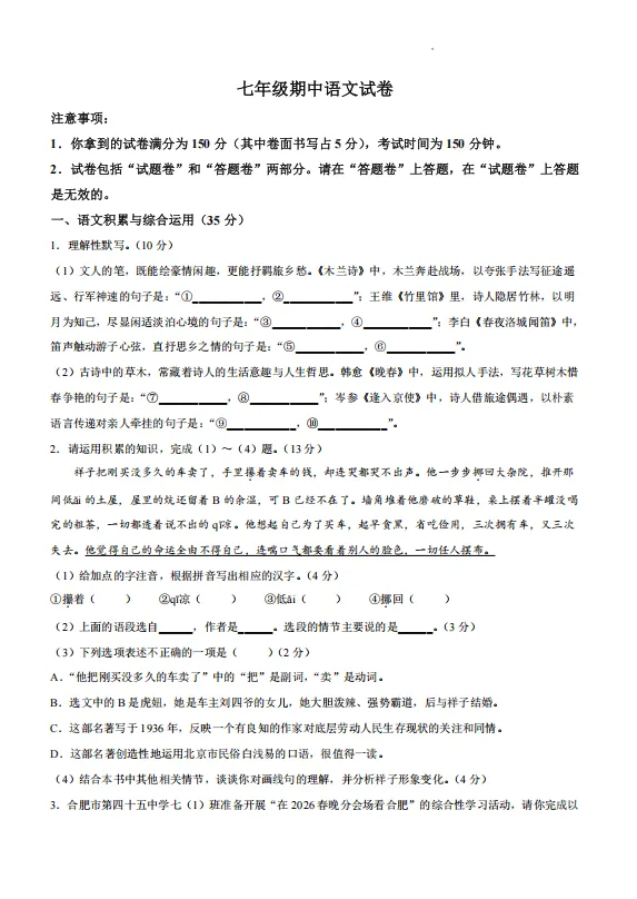 合肥45中2025-2026七下期中试卷