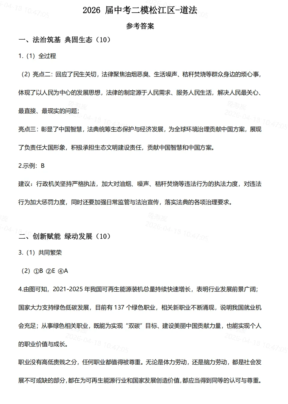 >4.20初三二模最后准备!松江二模试卷及答案备考