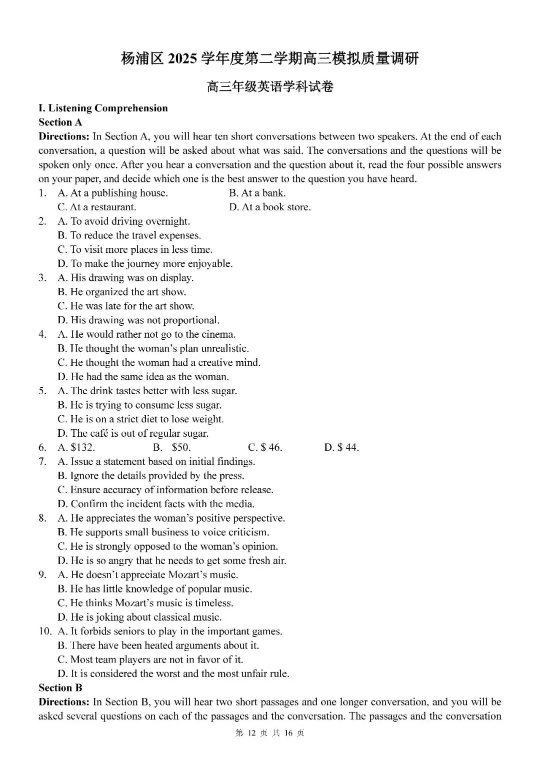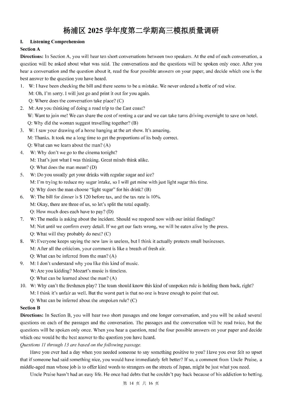 >2026届上海市杨浦区高三二模英语试卷(含答案)