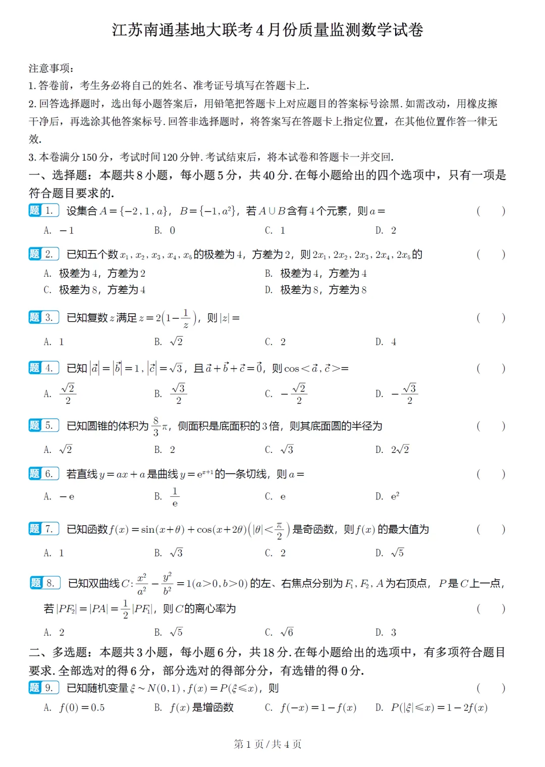 234.江苏省南通市高三调研考数学试卷及逐题解析(2026.3)