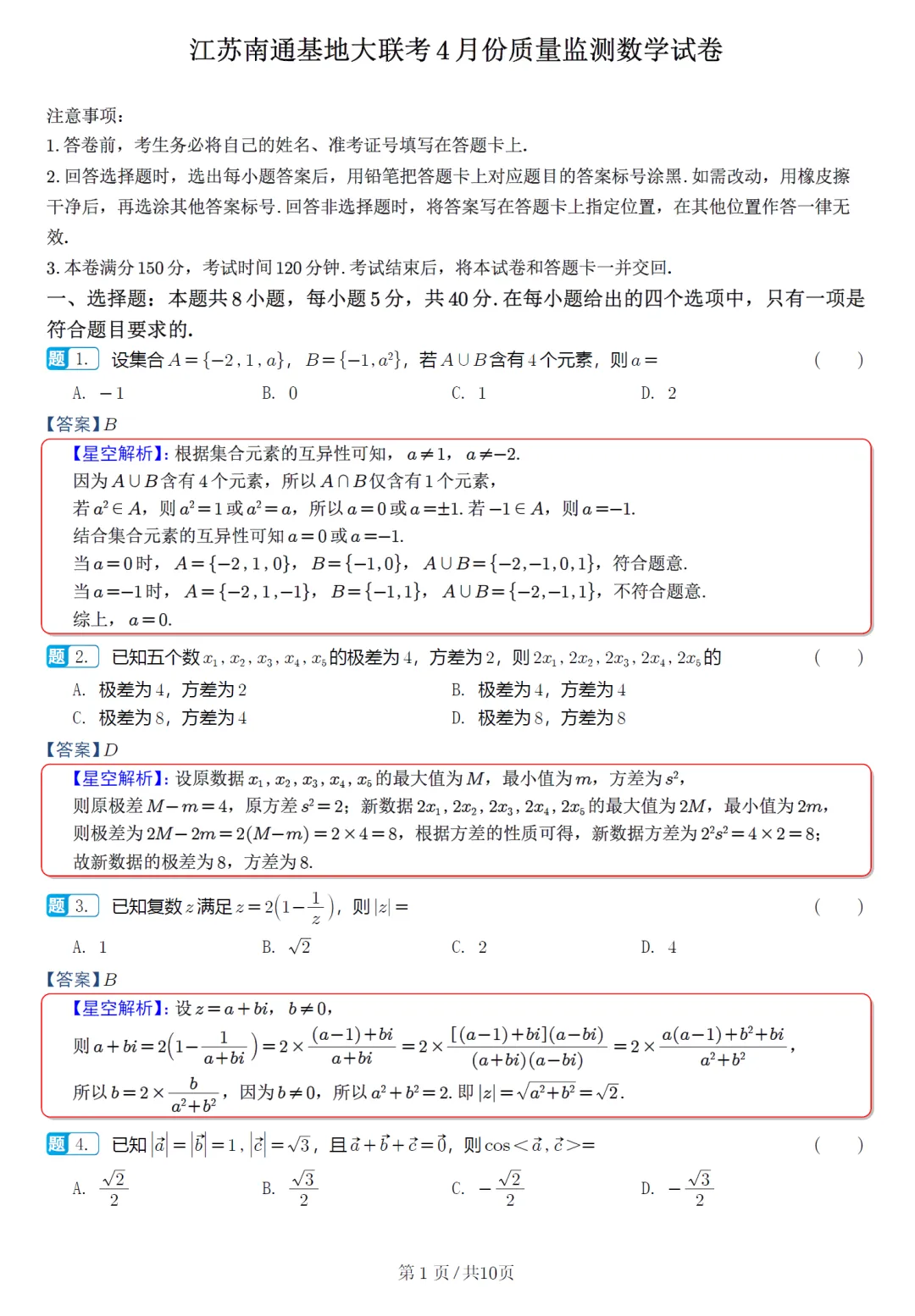 258.南京市五校联盟高三4月联考数学试卷及逐题解析(2026.4)