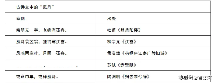 (3)老师让同学们根据下图中的主要元素,搜集古诗文中相应的句子,某同学制作了这个表格,其中还差一处举例,请你根据表格的内容将其补充完整。
