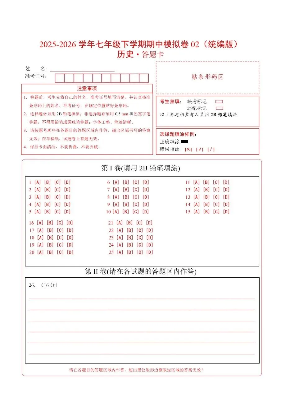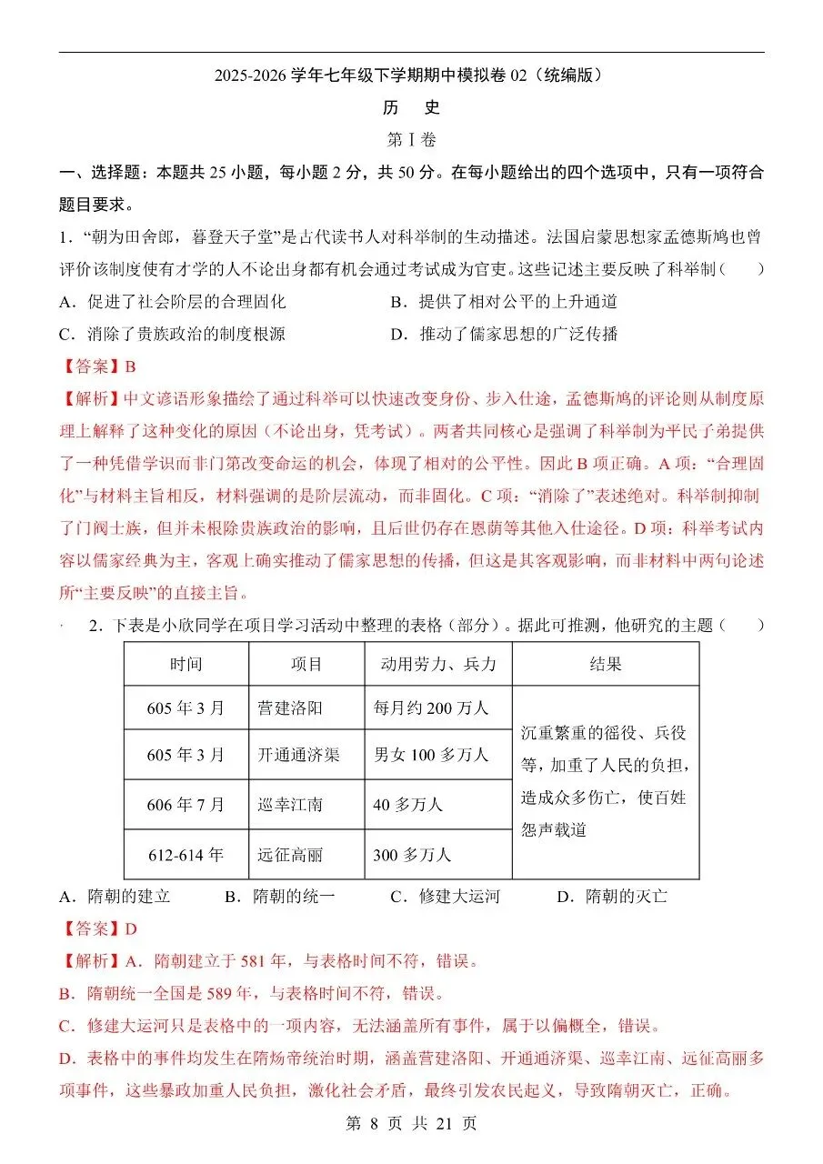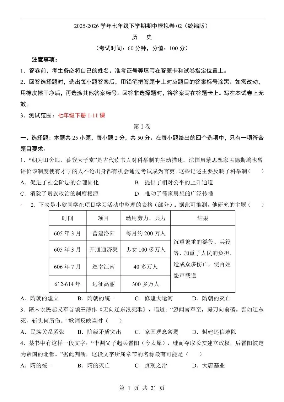 2026年春新版七年级下册历史期中考试卷共4套含答案可打印