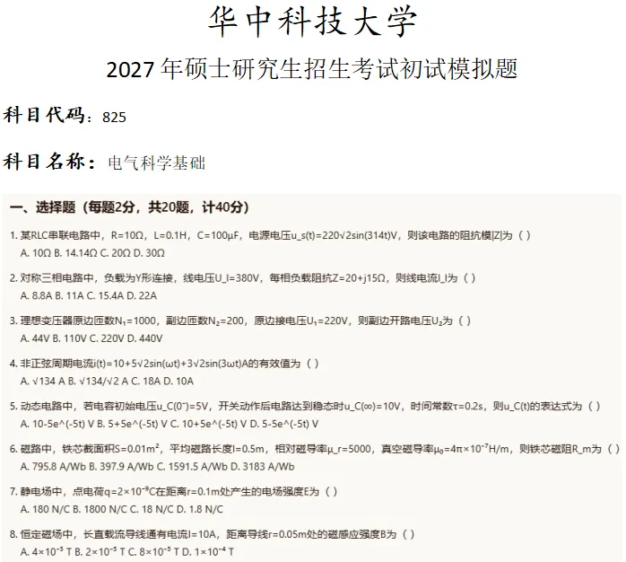 当前位置:首页>考研真题>华中科技大学825电气科学基础考研真题模拟