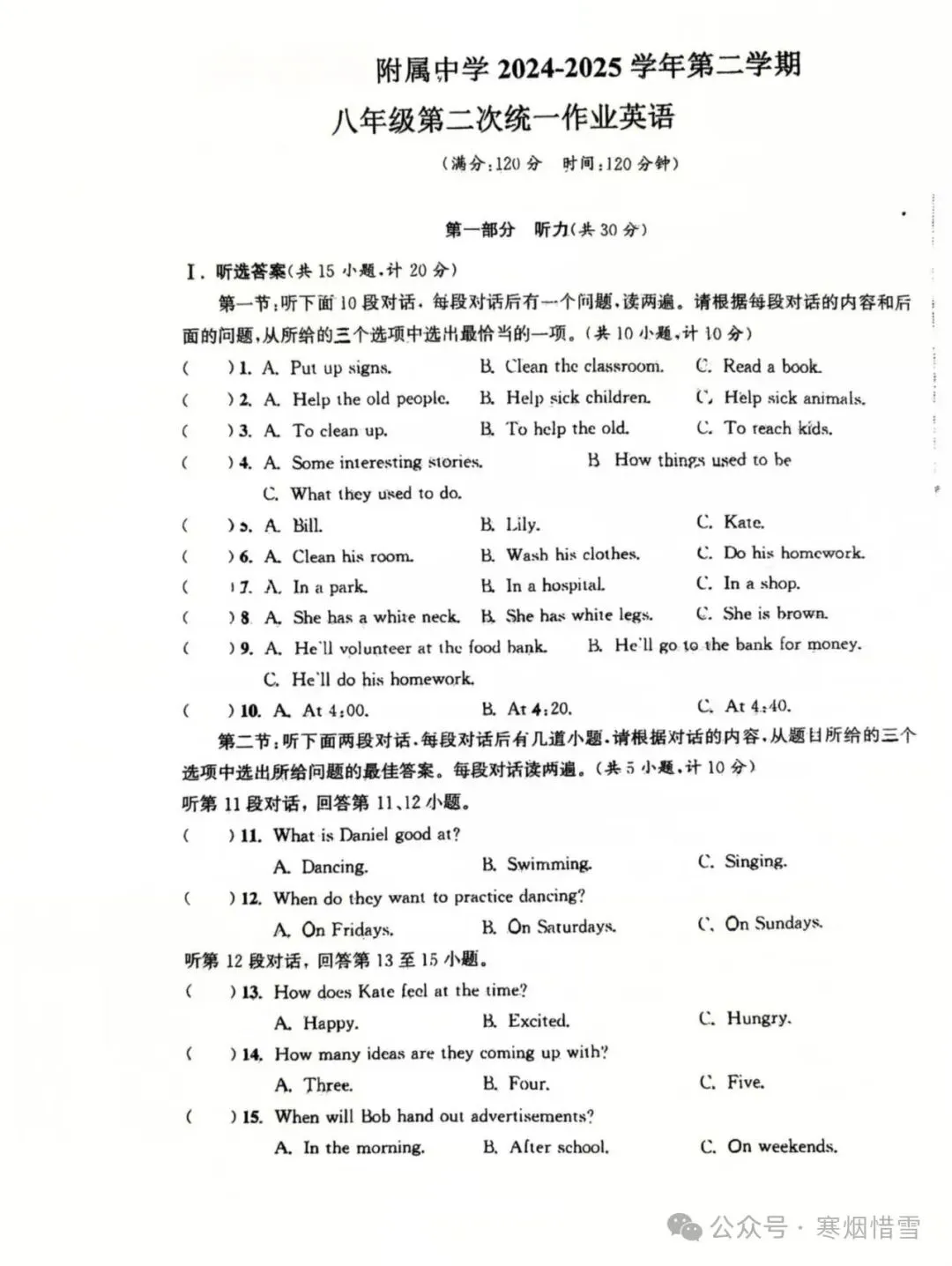 试卷收集| 2025-2026学年4月杭州市临平余杭中考一模