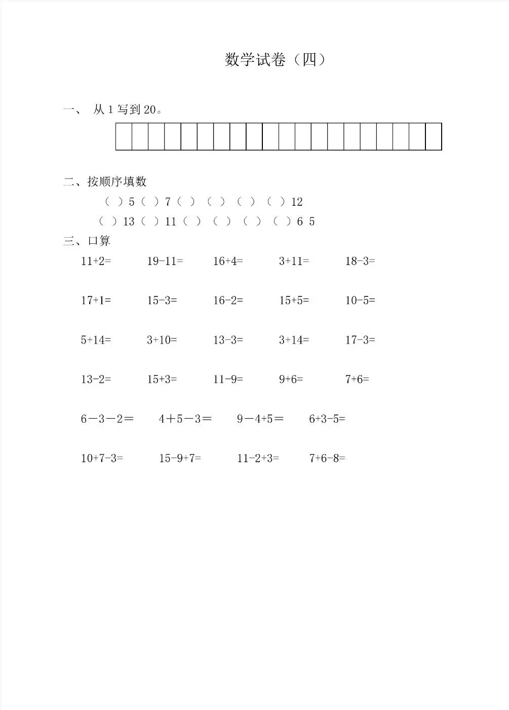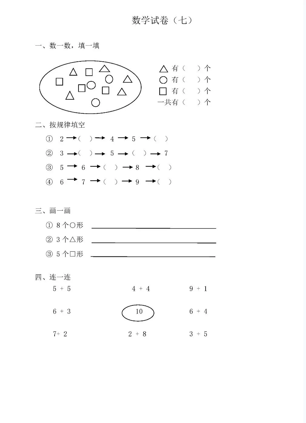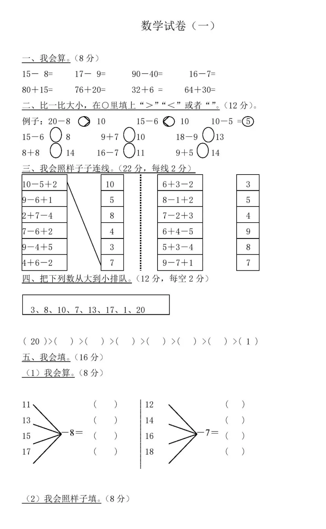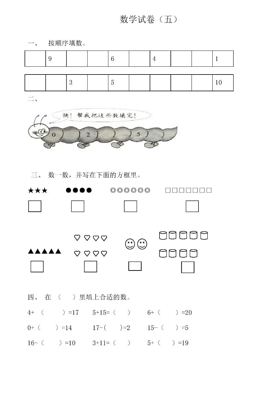 内容包括:数字书写、单双数、分解组合、顺序、序数、比较、看图列式、计算、填空、相邻数、应用题、图形、分类、时间、人民币等全部内容,综合练习35套。