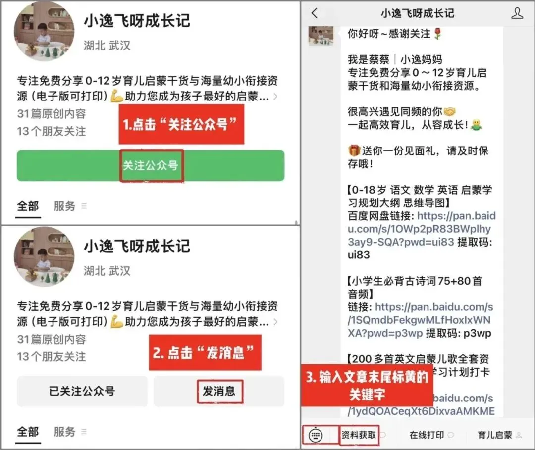 ②点击上方公众号卡片,按图123步骤,关注公众号后在对话框回复资料对应关键词:幼小衔接35套数学卷