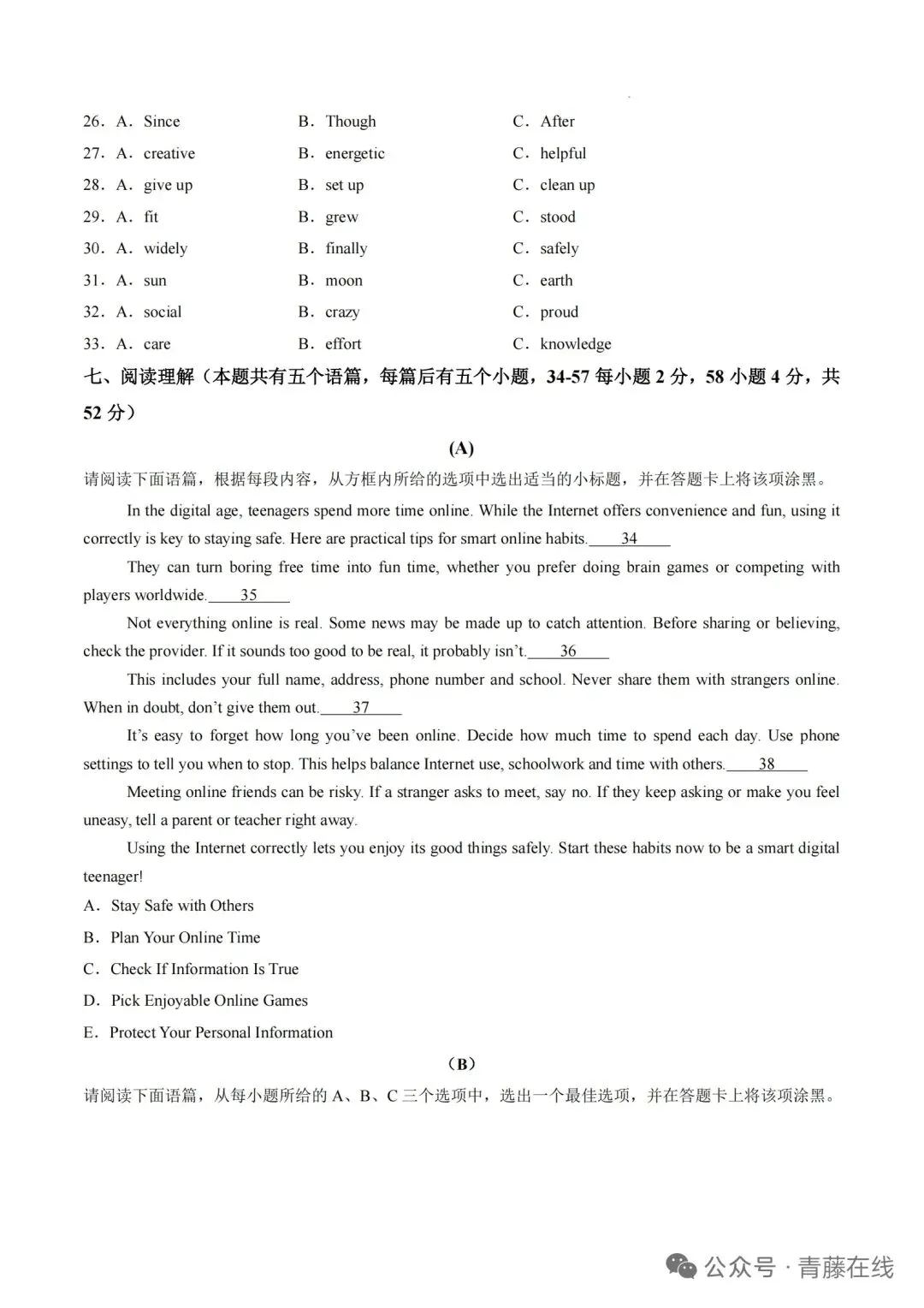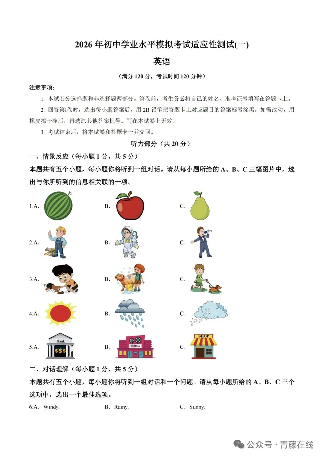 【适应性英语试卷+听力】2026年初中学业水平模拟考试适应性测试英语(一)+听力音频