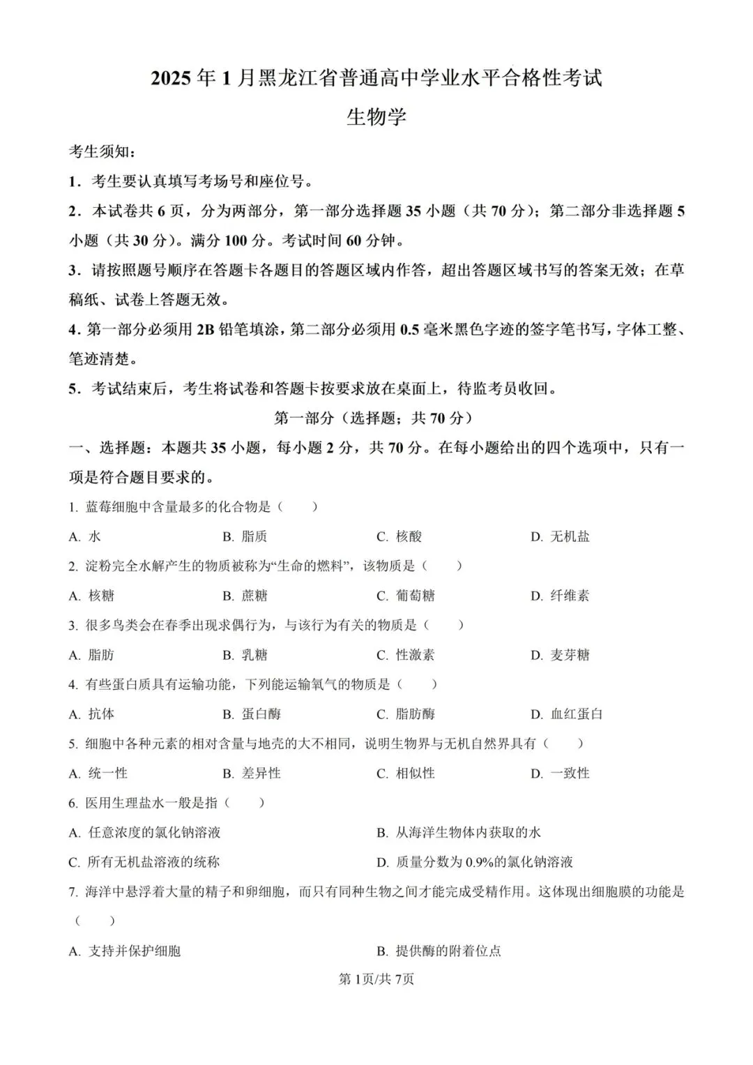 近5年黑龙江省合格考(学考)生物学试卷及答案解析