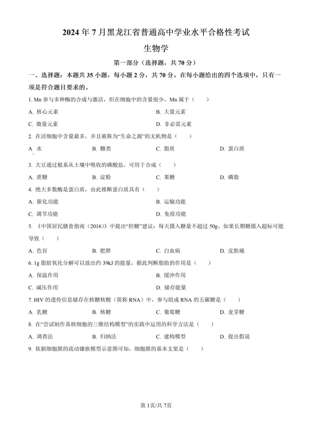 >近5年黑龙江省合格考(学考)生物学试卷及答案解析