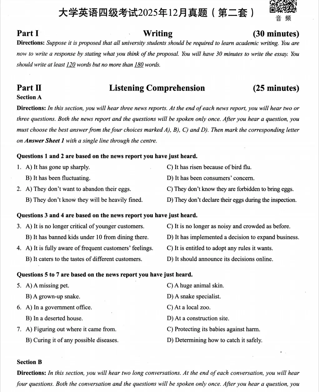 2025年12月英语四级真题及答案解析(第二套) |