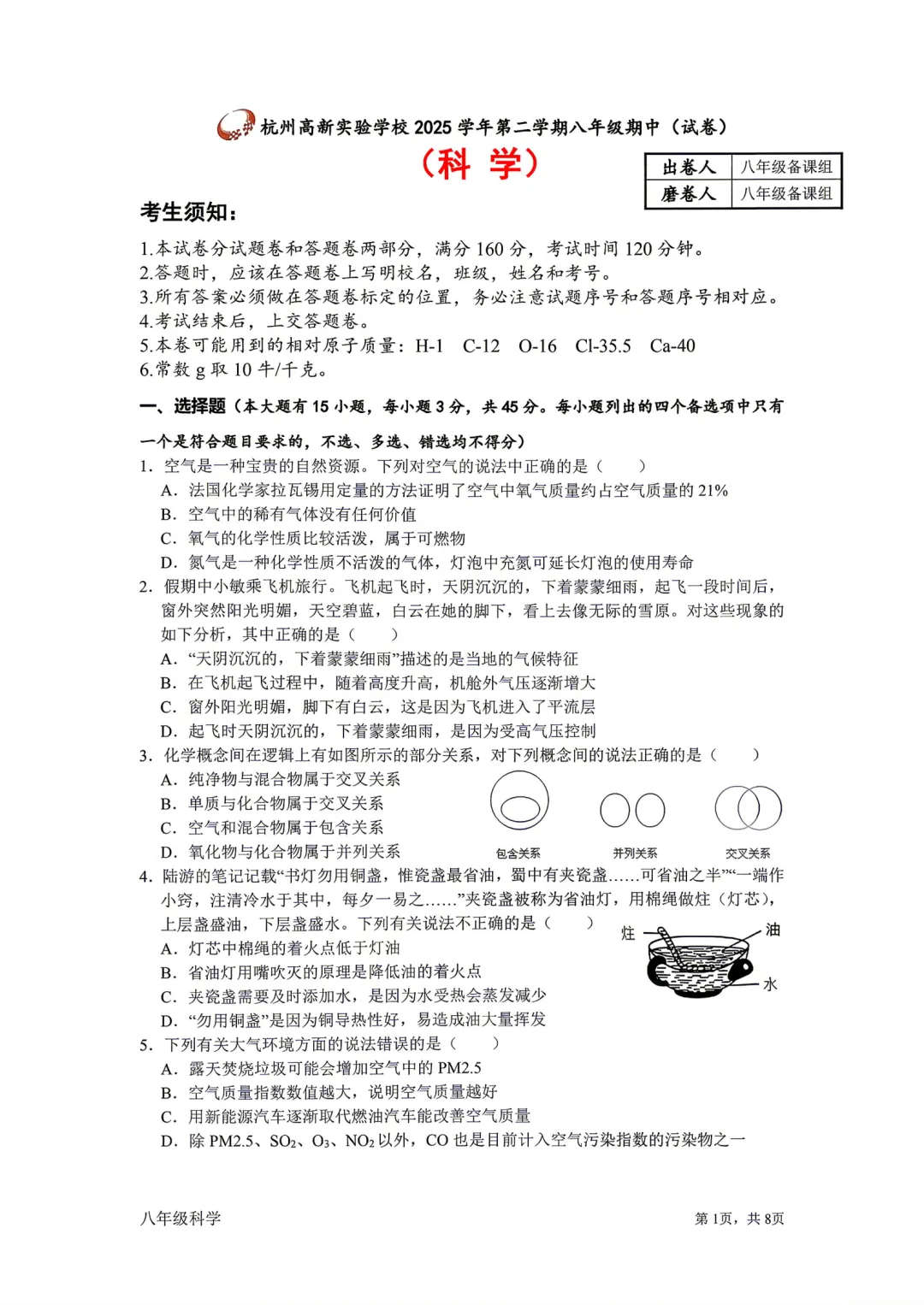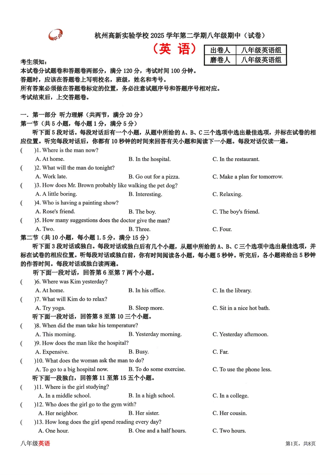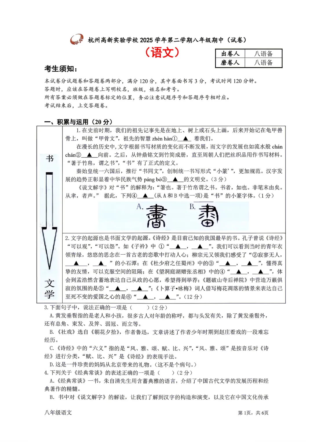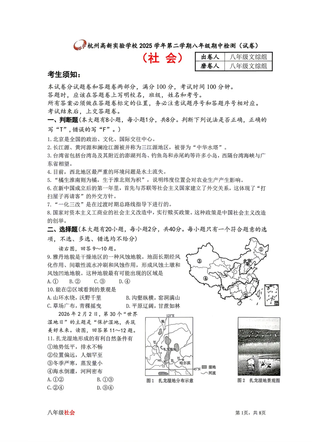 【期中真题卷-八下全科】2026.4杭州高新实验学校八年级下册语文数学科学英语社会期中试卷(附参考答案 听力)