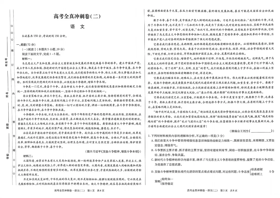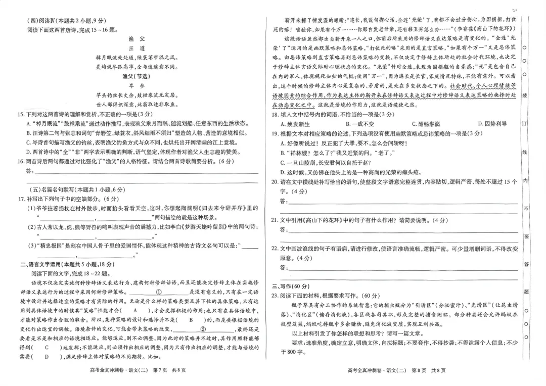 【二份好题】高中语文试题快题(试卷+答题卡+讲评课件+答案解析)