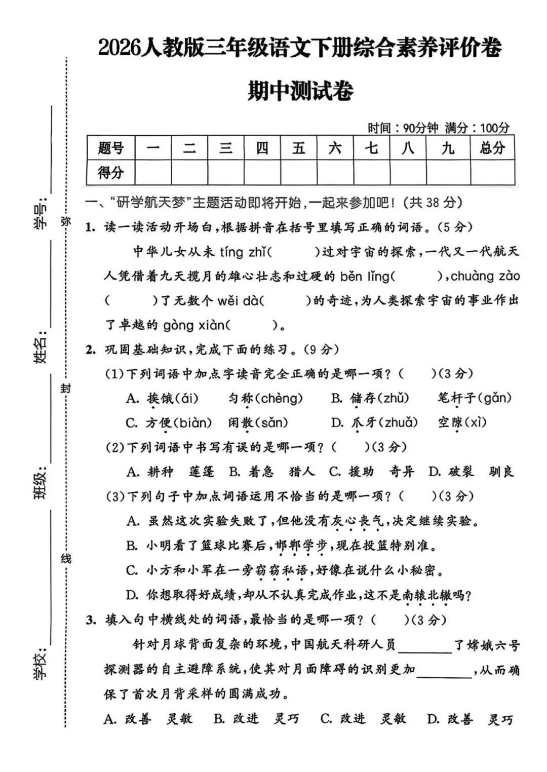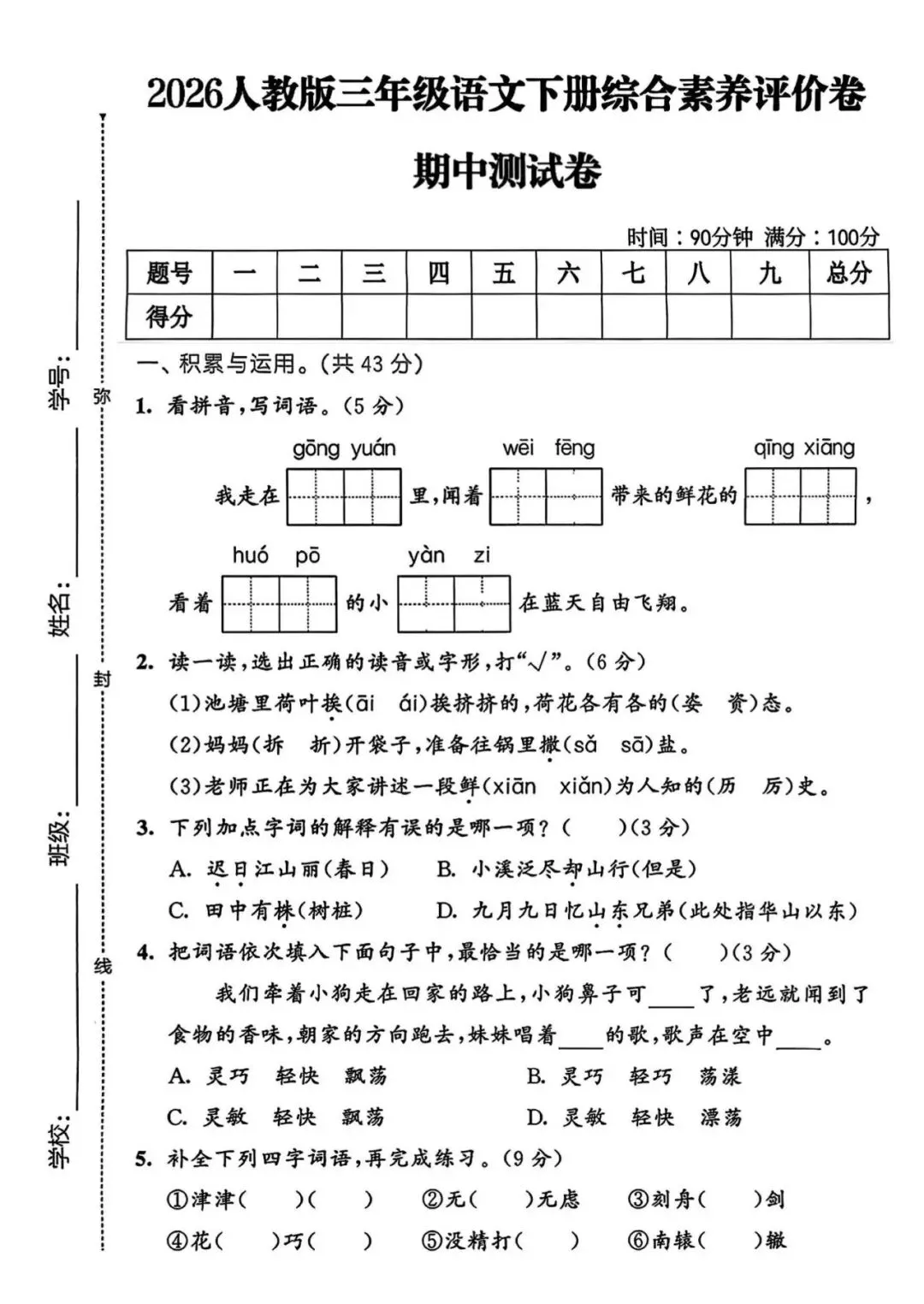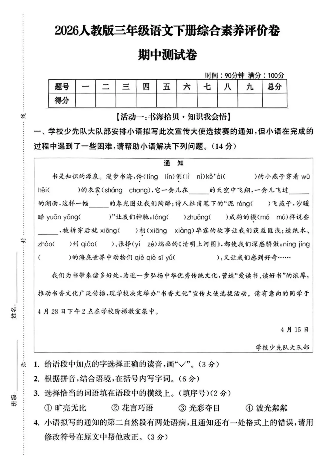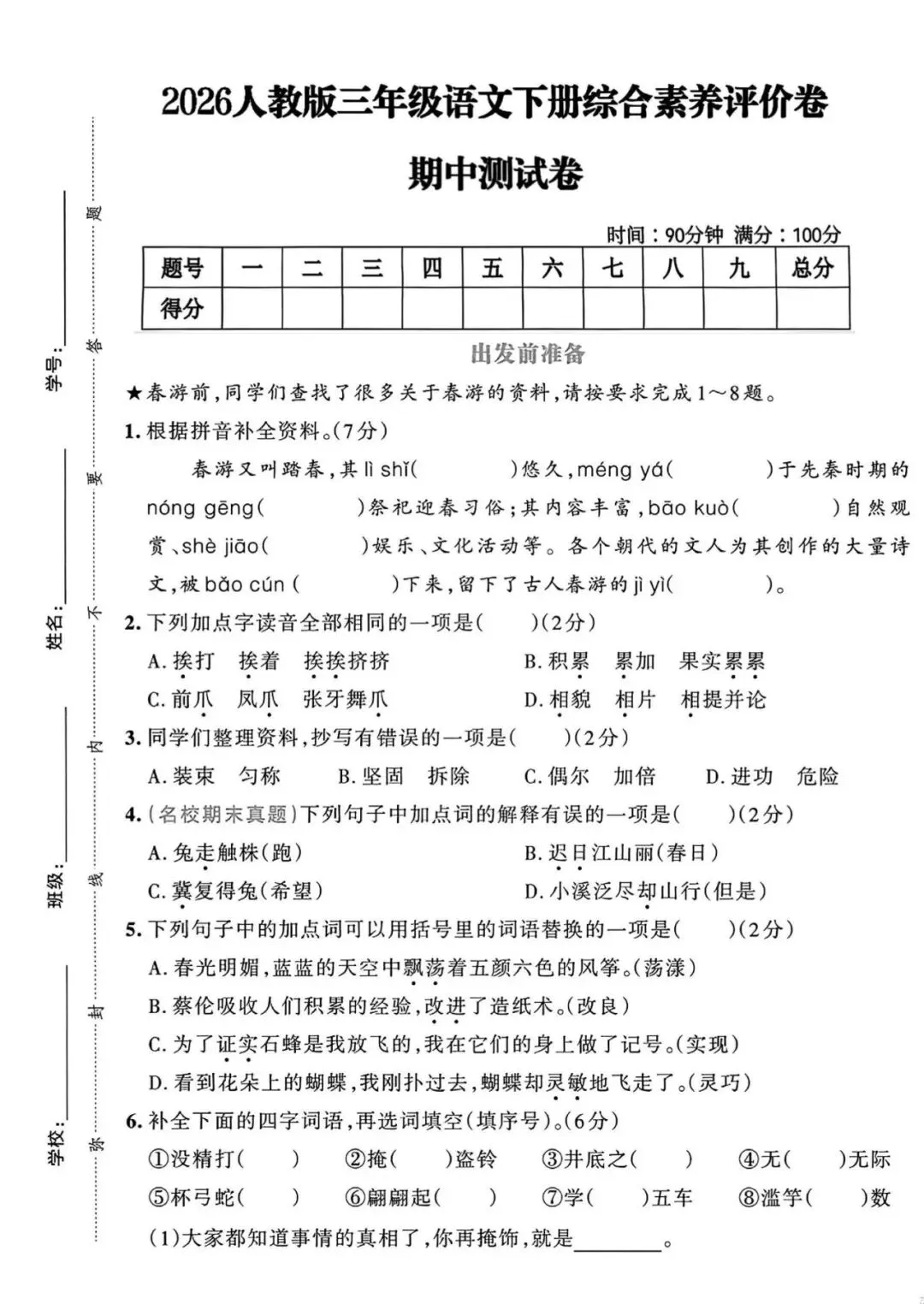 大家好,我是蒂尼江,今天分享的是【期中试卷】三年级语文下册期中情景测试卷,期中质量考试试卷,关注我,每天持续分享更多的优质学习资料。