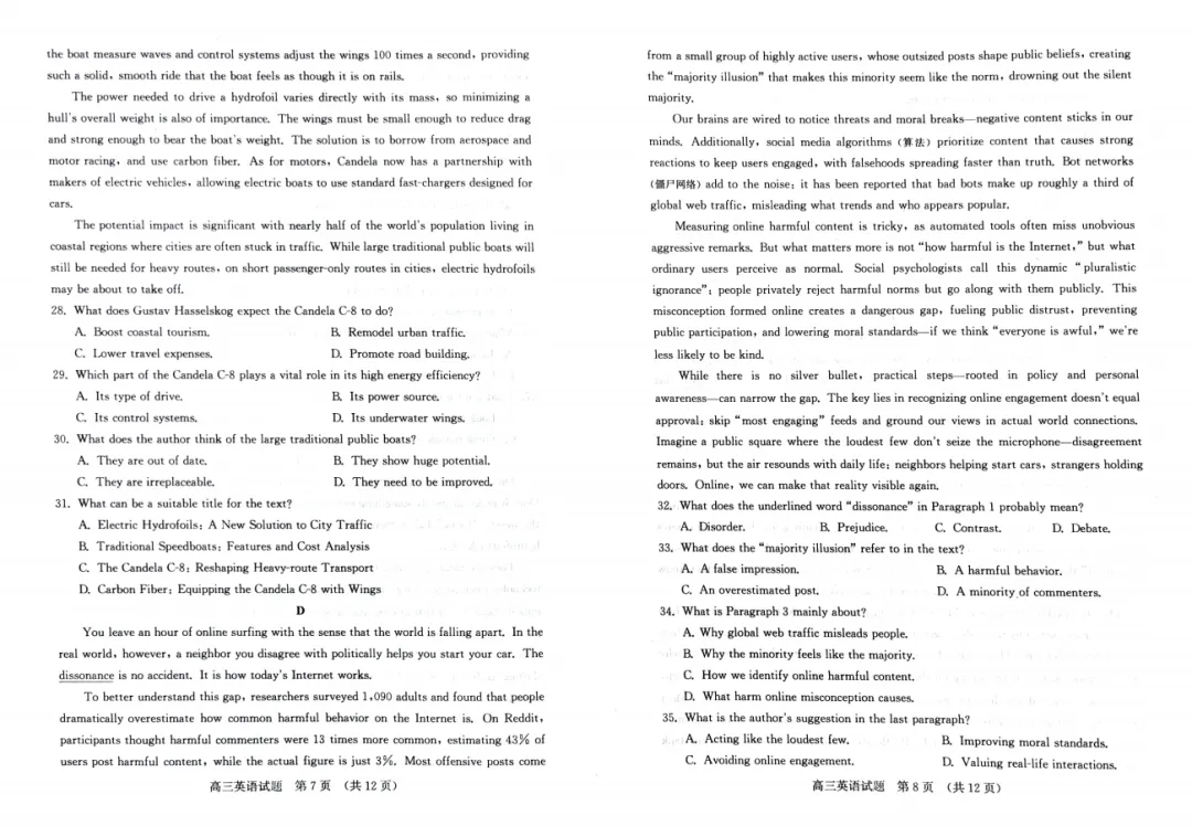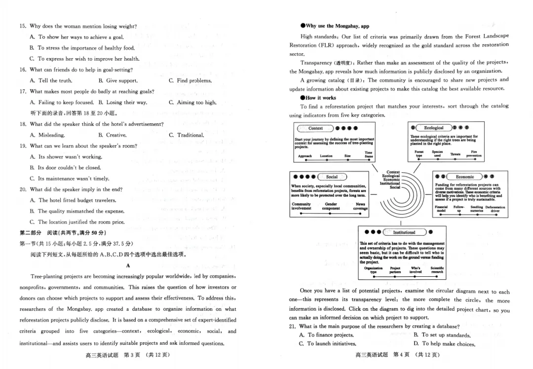 题目重点考查学生对英语基础知识的语境化运用能力,整体难度适中,聚焦真实语境中的细节提取、逻辑推理、情感理解与观点表达。相比一模,降低了纯逻辑推理难度,更侧重二轮复习的基础巩固与核心能力落地,贴合高三备考节奏。