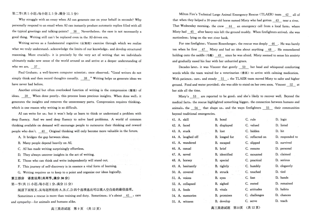 阅读题注重逻辑链构建:科技文围绕工作原理、核心价值、应用前景递进设问,考查对科技发展的系统性理解;非选择题凸显 “语境 + 情感 + 文化” 双重要求:完形填空以人马救援故事考查情感语境,语法填空将语法考点融入文化场景,强化语境化应用。