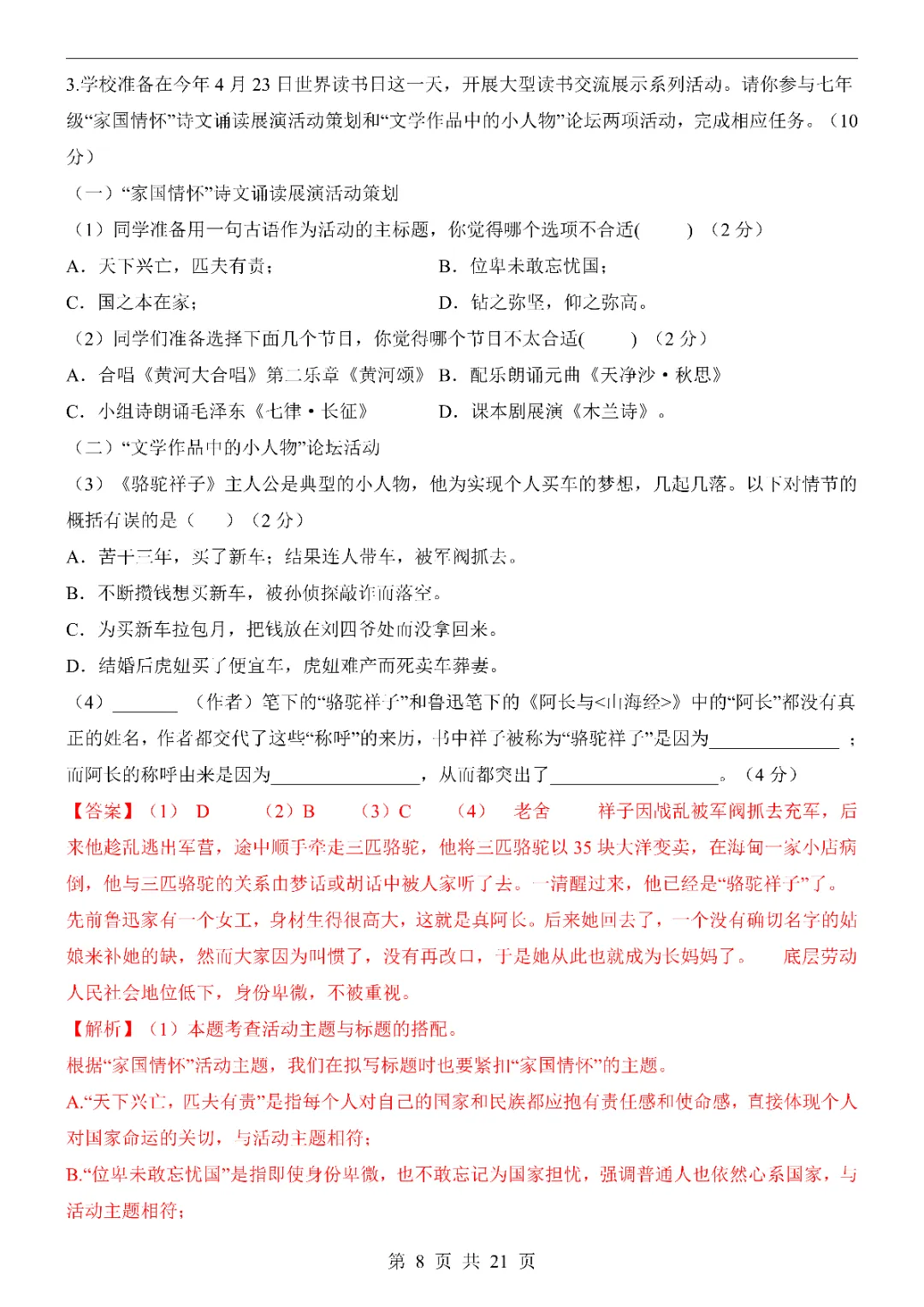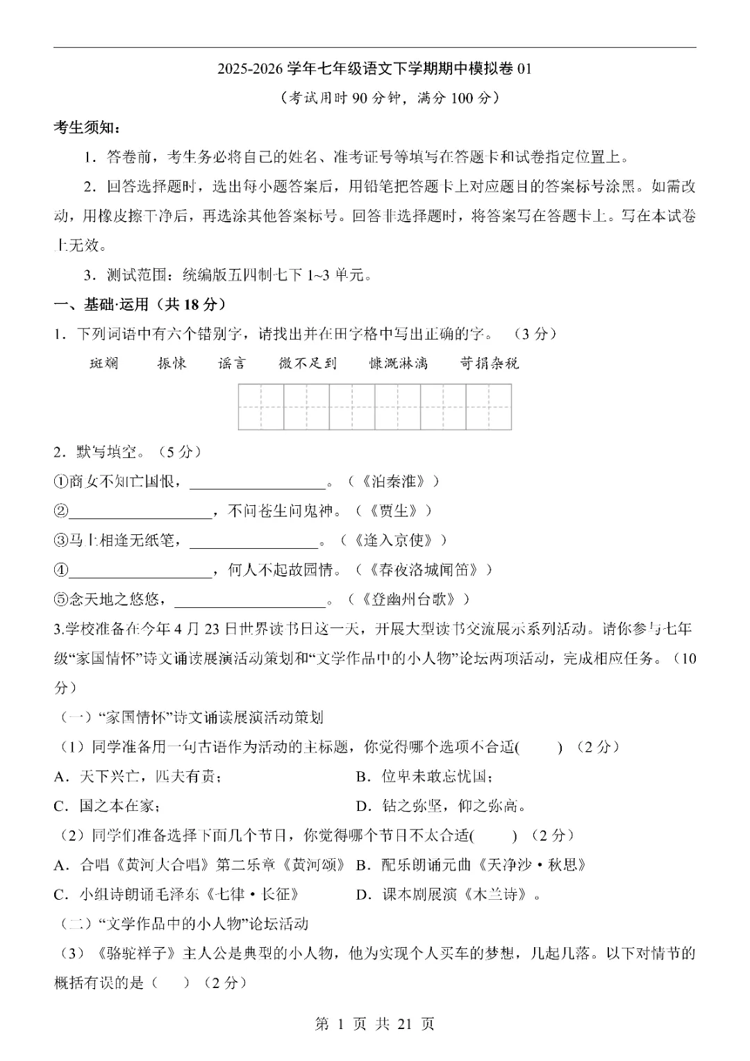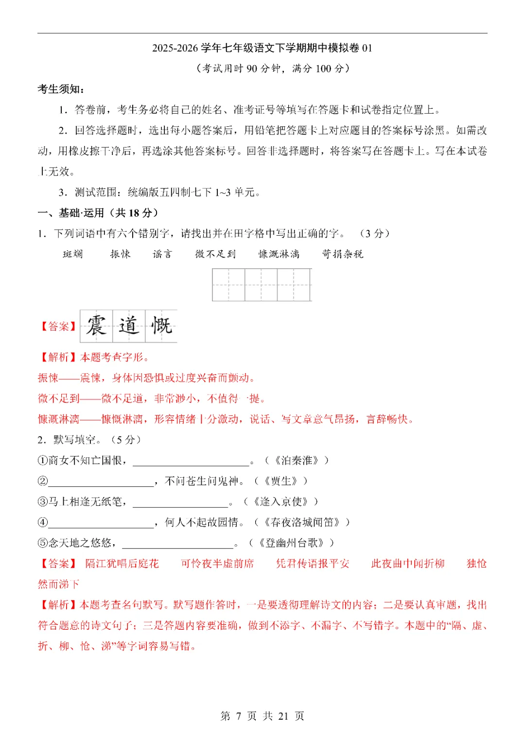 🌸 新版教材 | 2026年人教版七年级下册语文期中模拟试卷(完整版含答案),初一孩子期中考试复习必刷,建议先收藏保存,电子版可打印!