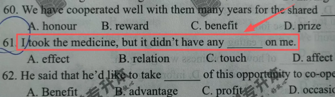 考点解析:考查单词辨析,根据句意选出合适的单词,affect 是动词影响,effect效果