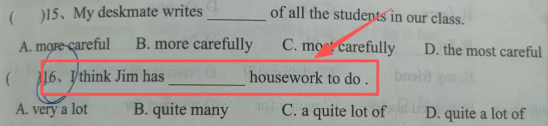 考点解析:考查副词的使用,homework 不可数名词,用a lot of 修饰
