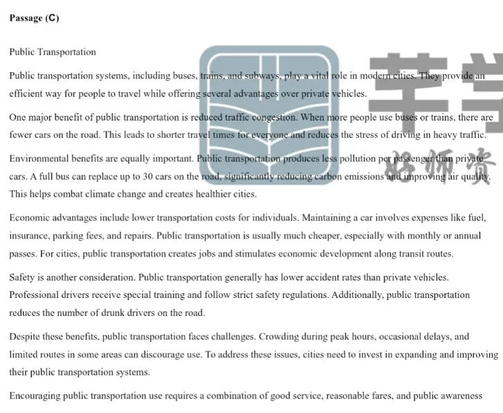 考点解析:公共交通(公交、火车、地铁)在现代城市中至关重要,相比私家车具有缓解拥堵、环保、经济、安全等优势,但也面临拥挤、延误、覆盖不足等挑战,需要城市投资改进。