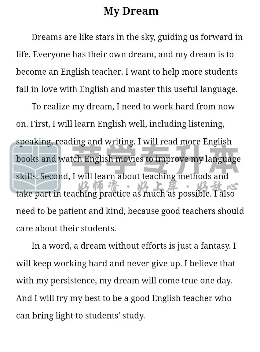 考点解析:If you study hard,you will make progress.考点解析:以我的梦想写文章,可以分为三个部分去写,写出自己的梦想是什么,其次写出为什么有这个梦想,最后谈谈自己将如何实现自己的梦想。