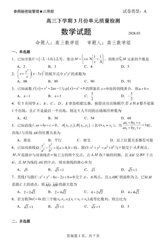 高中数学| 2026年广州二模数学试卷