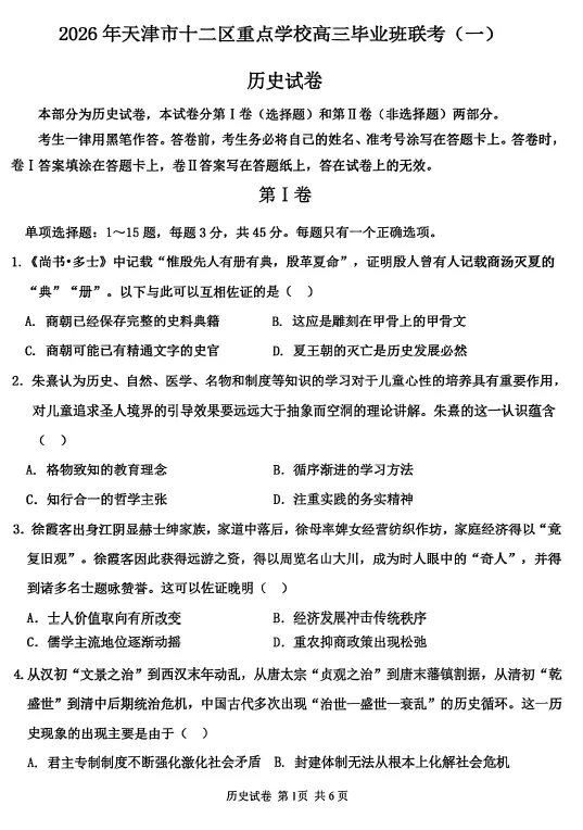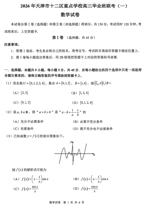>【高三试卷】天津市十二区重点学校2025—2026学年高三下学期毕业联考(一)(全科)