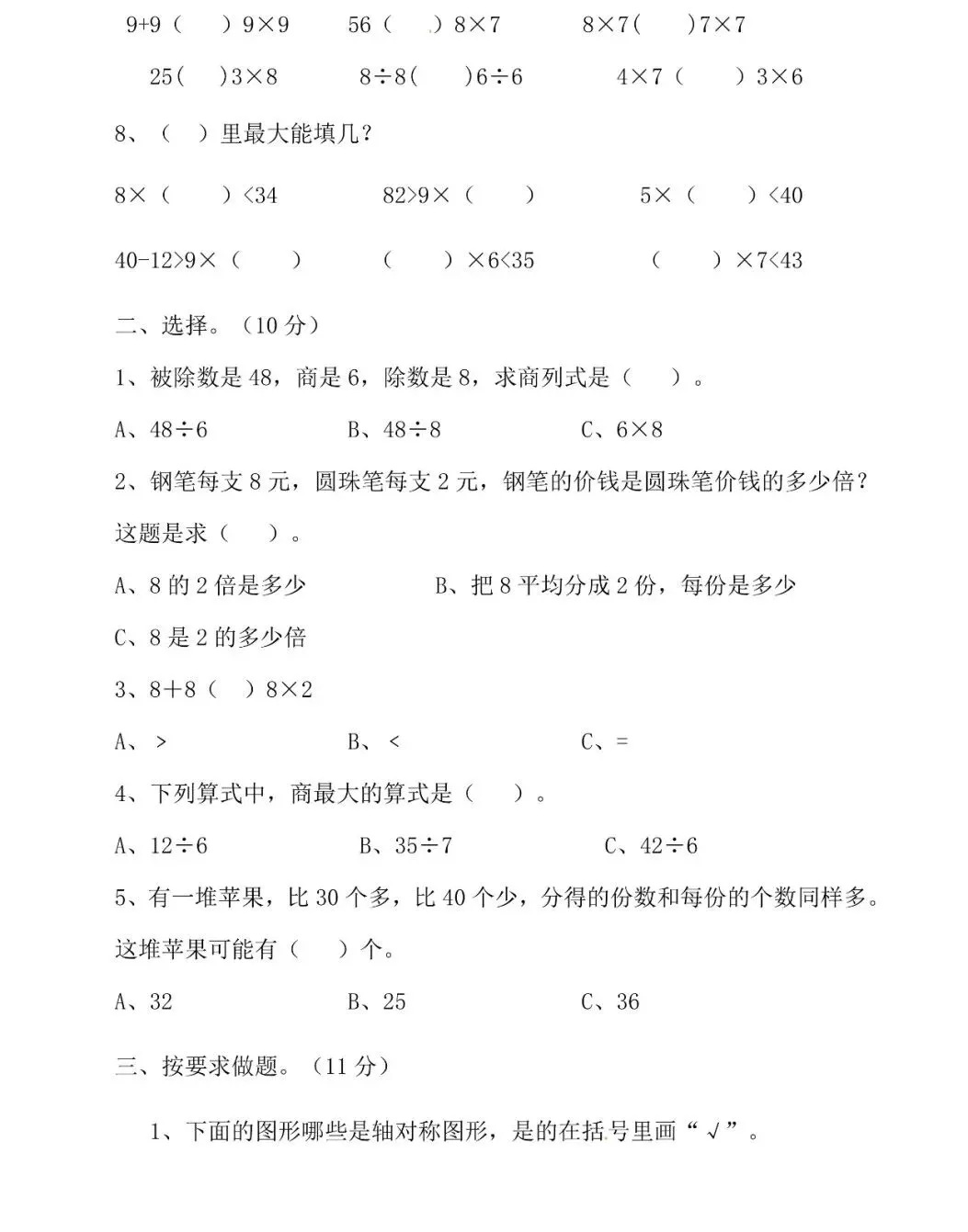 40÷( )=5 27÷( )=9 ( )×6=48