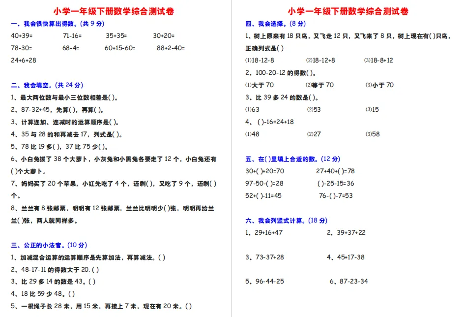 1、树上原来有18只鸟,又飞走12只,又飞来了8只,树上现在有( )只鸟,正确列式是( )