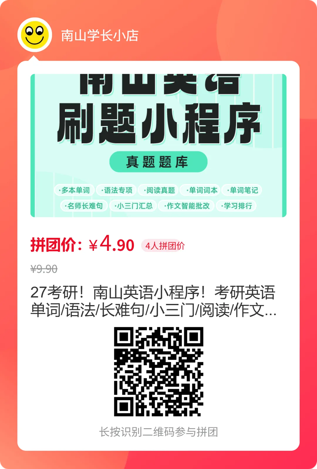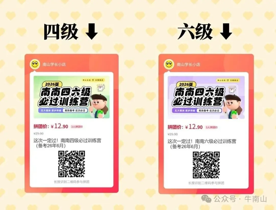 四六级训练营开始啦,这期的安排,我看了,比往期只给资料的模式好的多,每天都有任务安排,正儿八经的跟下来,我个人感觉过四六级会比较容易,大家可以扫码看看~
